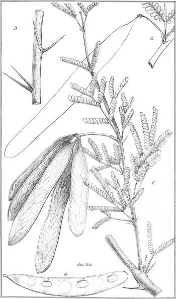 Arbor erecta ramis cortice fusco-glabro, in junioribus anguloso-striato pallidiore; spinis validis interdum abortivis ½-2-pollicaribus rectissimis horizontaliter patentibus sensim attenuatis supra planis latere 2-angularibus pallidis rarius fuscescentibus; foliis puberulis saturate viridibus bipollicaribus, pinnis 6-13-jugis, foliolis 12-20-jugis parvulis acutiusculis apice paullo latioribus longitudine latitudinem 5-superantibus, petiolo communi basi 1-glanduloso; inflorescentia coaetanea, spicis in axillis 2-3-aggregatis vel solitariis, latis, 1-4-pollicaribus, flavis folium subaequantibus vel duplo superantibus, floribus subremotis, albidis (?), leguminibus longiuscule pedicellatis late-oblongis 2-pollicaribus obtusis[360] mucronulatisve marginibus parallelis subcoriaceis planis fuscis nitidis irregulariter venosis paullo pulposis 6-12-spermis, seminibus olivaceis oblongis.