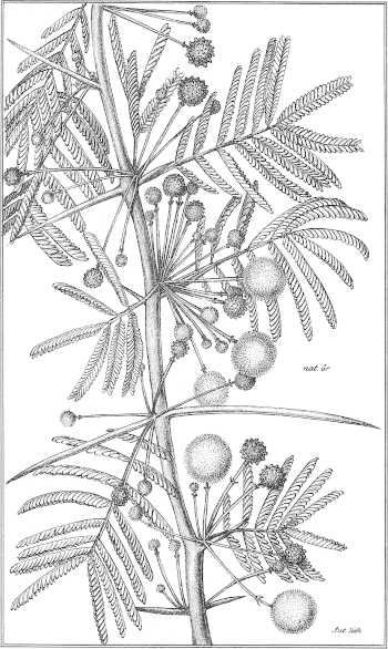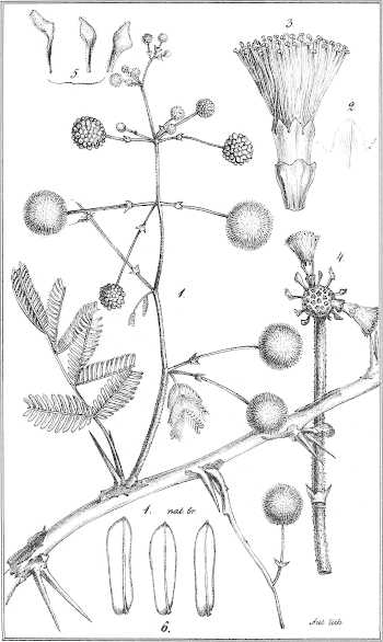 Ramulis pubescentibus, stipulis parum spinescentibus interdum coriaceis brevibus e basi lata subulatis erectis; foliis[361] maximis 8-12-15-pollicaribus pinnis 20-30-jugis, foliolis 30-40-jugis linearibus cultriformibus acutiusculis mucronulatis longitudine latitudinem 4-5-superantibus siccis rufescentibus petiolo communi tomentello basi 1-glanduloso; inflorescentia coaetanea panniculam laxam terminalem efoliatum efformante, pedunculis 3-5-fasciculatis, ½-1-pollicaribus medio vel infra medium bracteolatis, capitulis (aurantiacis?) siccis badio-ferrugineis; leguminibus coriaceis fuscis nitidis obsolete irregulariterque venosis, planis oblongo-linearibus 5-6-uncialibus, 8-11-spermis, seminibus compressis subrotundis acutiusculis, latere linea circulari impressa notatis.