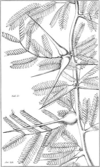 Bis zu welchem Grade die wesentlichsten Merkmale der Exemplare je nach der Region des Astes, welchem sie entnommen wurden, abgeändert werden können, das zeigt uns[314] beispielsweise das Auftreten zahlreicher Stacheln am Mittelnervstiel[1] der Blätter des Stockausschlages von A. Catechu, ein Fall, welcher sich an üppig entwickeltem Laube der A. mellifera wiederholt. Ein ähnliches Beispiel liefern die oft fast nur mit gekrümmten, verkümmerten Dornen bedeckten blühenden Zweige der A. tortilis oder spirocarpa, auch diejenigen der A. glaucophylla und anderer, welche an solchen Zweigen oft alle Stacheln verlieren. Der unter dem Blattstiel sitzende dritte Stachel der Diacanthae fehlt oder erscheint, je nach der Art der Zweige, welche vorliegen, u.s.f.