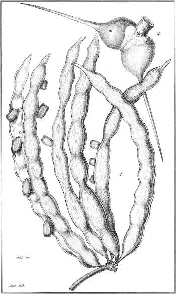 Taf. XXI. 1. Zwei Hülsen mit 3 und mit 4 Samen. 2. Hülse mit 1 Samen. 3. Dito mit 2 Samen und langer Spitze. 4. Dito mit 2 Samen und stumpfem Ende. 5. Dito mit 4 Samen, von geringerer Grösse und ohne Einschnürungen. 6. Dito mit 5 Samen, von ausnahmsweise länglicher Gestalt. (Alle nat. Gr.) 7. Same. 8. Längsdurchschnitt durch einen Samen. 9. Same von der Rückenseite gesehen.