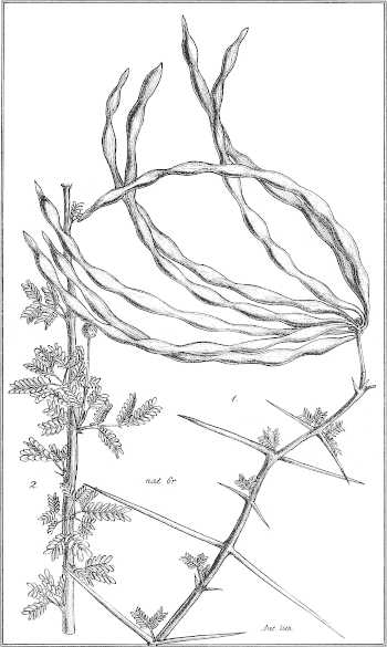 So bilden denn auch im Nilgebiete die Acacien, soweit wir den Ufern des grossen Flusses nach Süden zu folgen wollen, oder so fern von demselben wir uns auch seitwärts in die anstossenden Gebiete hineinwagen, mit den wichtigsten Bestandteil der Baumflora. Die Wüstenthäler entlang erreichen wir in ihrer steten Gesellschaft das Meer, oder ziehen durch die mit ihnen wie übersäeten Steppenwüsten, durchdringen ihre buschreichen Dickichte meilenweit innerhalb hochgrasiger Prairien und stossen schliesslich auf sie, eine ebenbürtige Zierde des Tropenwaldes, als Genossen von Tamarinden- und Feigenbäumen.