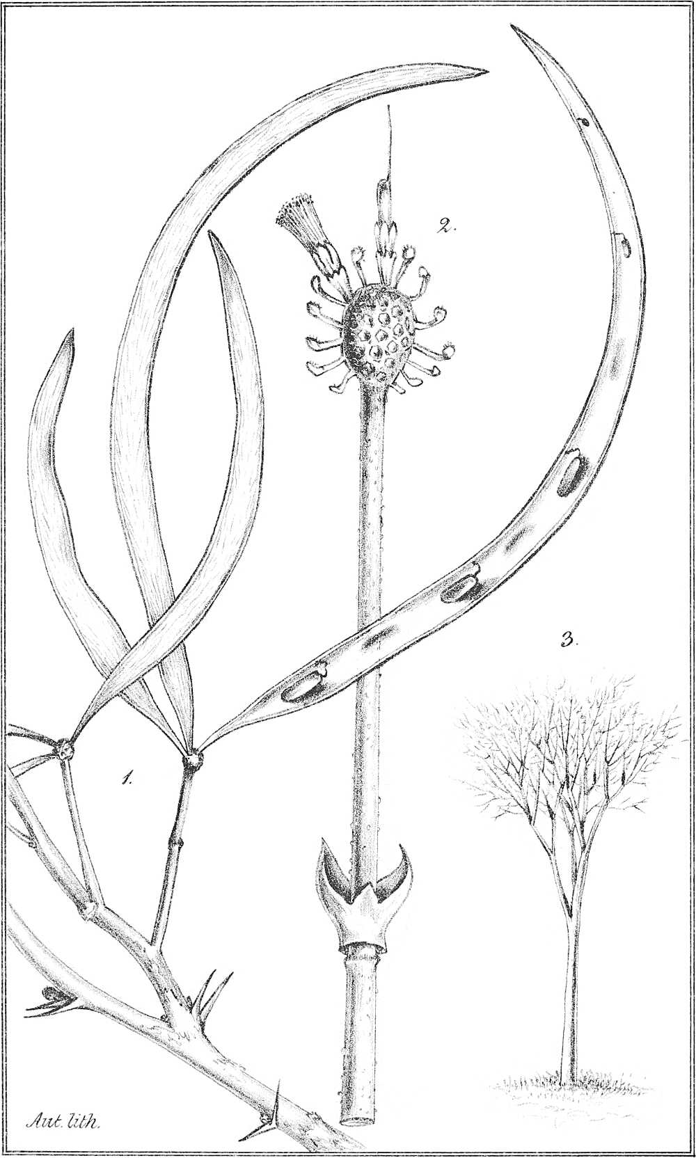 Taf. XX. 1. Blattzweig. (Nat. Gr.) 2. Blättchen (vergr.). 3. Zweigtheile mit gedreiten Stacheln. (Nat. Gr.)