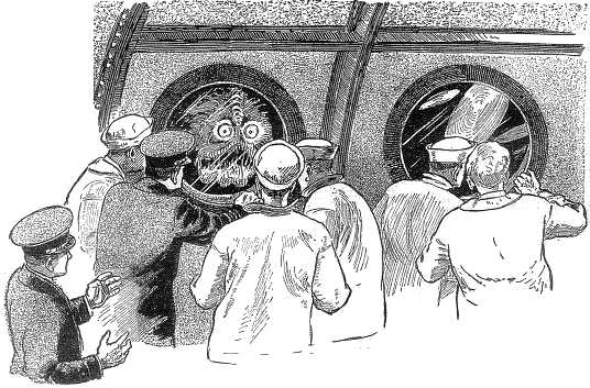 And as we sank downward, we became aware that we were not the only living creatures in these depths. Our searchlights made us the center of attraction for myriads of scaly things; whole schools and squadrons of fishes were gathering moth-like in the vivid illumination thrown out by our vessel. Some were long, snaky monsters, with thin heads set with rows of spike-like teeth, and tiny eyes that gleamed evilly in the uncanny light; some were lithe sea dragons, with wolfish mouths and sabre-like bony appendages projecting from low foreheads; some were many-colored, rainbow-hued or streaked with black and golden, or red and azure, or yellow and white; some had chameleon eyes that flashed first green and then blue, according to the play of the light about them; many were flitting to and fro, circling and spiralling and doubling back and forth at incredible speed; and not a few, unacquainted with the ways of submarines, collided full-tilt with the thick glass of our portholes.