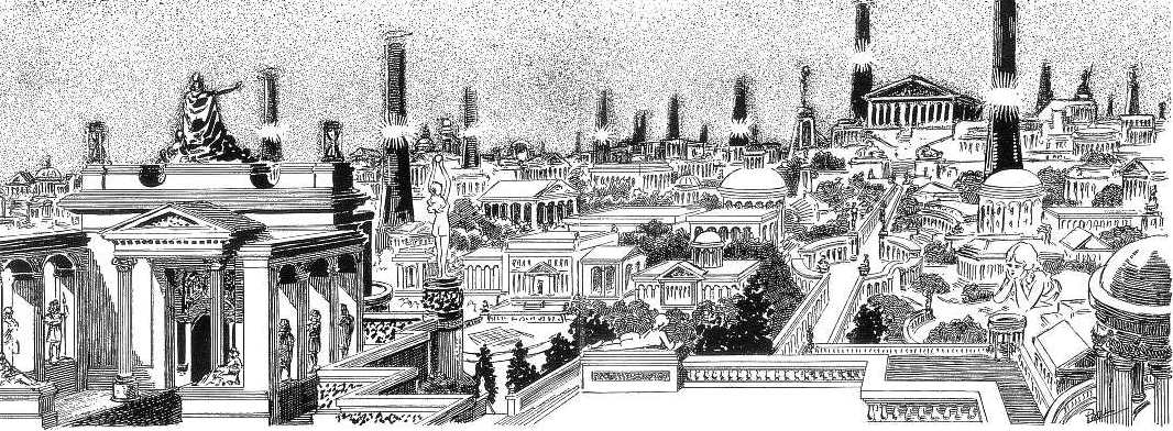 Then, as the searchlights swayed and shifted till they swept the depths directly beneath, we began to make out familiar objects amid the obscurity. Dimly, strangely, as though draped in a fog, the outlines of great domes and arches and colonnades began to emerge, interspersed by Titanic columns and statuesque temples that appeared to waver uncannily.