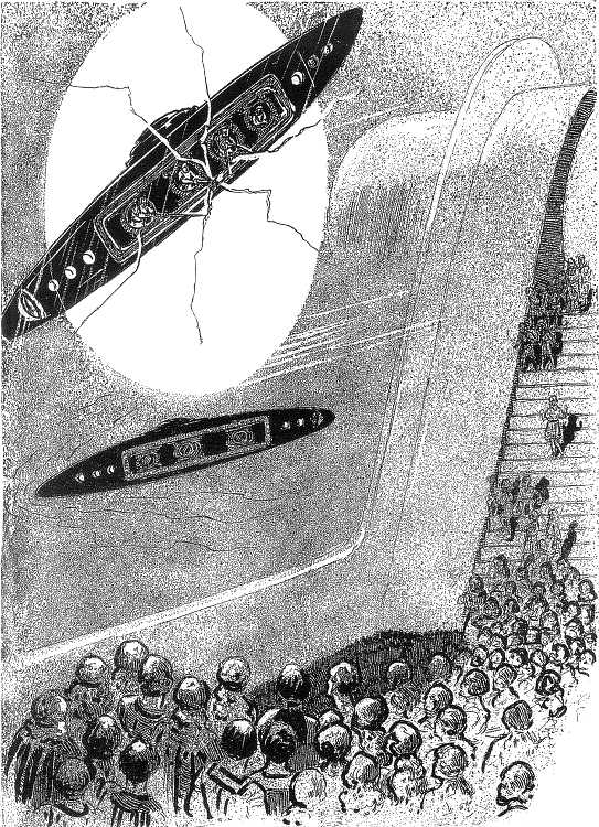 It would be impossible to convey any idea of the commotion which these words created. The people did indeed follow the High Chief Adviser’s advice to be courageous, for there was no more than a hint of that panic which one might have expected. But there could be no further thought of the performance in the theatre. After an instant’s chill silence, the audience arose with one accord; and men’s faces were blanched and women could be heard muttering in fear as the crowd began pushing toward the exits. In their excitement, the people had forgotten their usual courtesy; and Aelios and I were shoved and jostled in a way that reminded me of the New York subways. It was all I could do not to lose track of her amid the mob; yet both of us were anxious not to be separated, particularly since the speechless eagerness of the throng, the sighs of women, the rapid breathing of men and our own fast-beating hearts, all served to fill us with grim forebodings.