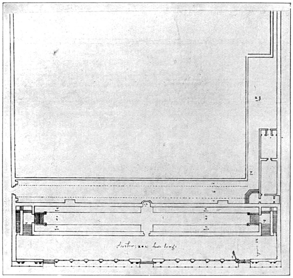 “A second description of this building is to be found in a rather unexpected quarter. In 1597 Sir William More, of Loseley, as executor to Sir T. Cawarden, sold to James Burbidge a certain great building with yards and subsidiary structures adjoining, of which the description in the deed of sale leaves no doubt that it was the upper frater and its adjoining buildings of the earlier survey.[40] If any further [262]proof were needed beyond the similarity in description it is found in the fact that the upper frater is the only available building once belonging to Sir Thomas Cawarden that his executor could have sold. The description in the deed is too lengthy and involved to be quoted in full, but it describes a building three storeys high, the top floor being formerly one great room with staircases leading up to it, bounded on the north by the Pipe office and its yard (formerly the kitchen yard). This was the structure that James Burbidge transformed into the celebrated Blackfriars Theatre, and a document recently discovered by Dr. Wallace gives its internal dimensions as 66 ft. by 46 ft.[41] It will be at once seen that the width 46 ft. internal agrees admirably with the external width of the upper frater, 52 ft., allowing some 3 ft. for each side wall. The difference in length is accounted for by the fact that Burbidge did not make use of the whole building, but divided off the northern part into ante-rooms and apartments for the children of the chapel, &c., leaving 66 ft. out of 107 ft. for the theatre itself.[42]