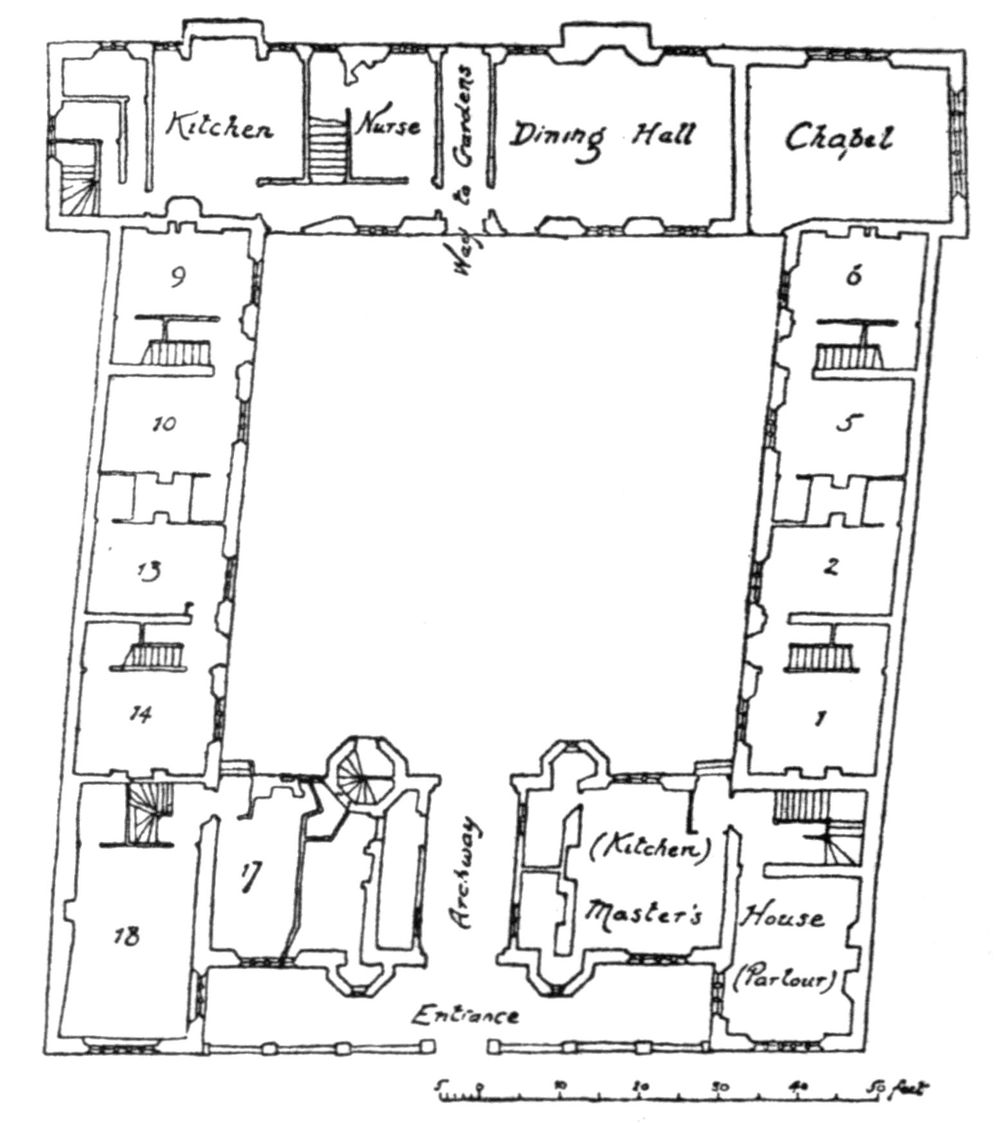 Of the remaining papers, I will merely add that they represent for the most part some particular studies in the more general examination of London buildings which I have undertaken. The articles on Chelsea are an amplification of the material prepared for the Survey of that Parish.[5] That on Crosby Hall is the substance of a lecture delivered before the London and Middlesex Archæological Association, soon after the Hall’s reconstruction. The interpretation of the original Specification of Elizabethan date for the erection of the Fortune Theatre was originally undertaken for Mr. William Archer, and the full details as here presented were first published in the Architectural Review . The only paper that deals with a subject outside London is that on Abbot’s Hospital, Guildford, which provides an excuse for a short account of the chief points of interest in the history of English Almshouses and their plans. I am indebted to Mr. Clapham for details of the building dates of Eltham Palace, which are preserved in the Record Office.