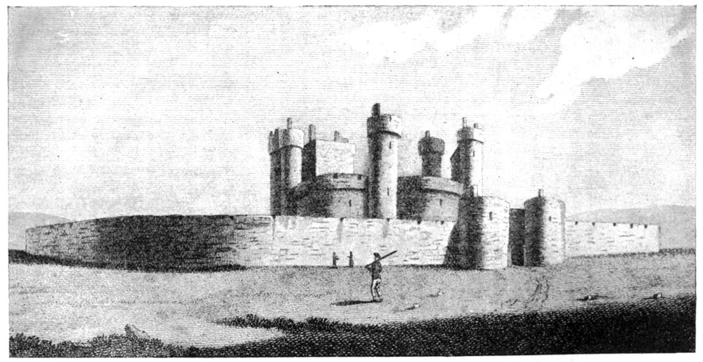 The Island of Sheppey, on which it stood, is a dreary tract of country, separated by a sluggish waterway from the mainland of Kent, and rising on the north side in the low hills of Minster. Since the destruction of the castle, its sole claims to architectural interest are centred in the priory church of Minster and the fine parish church at Eastchurch. The Castle of Queenborough, of which only the earthworks now remain, was begun by Edward III. about the year 1361, and took about six years to build; but from that time little is heard of it till it entered into the extensive schemes of Henry VIII. for the defences of the southern coast, when the building was repaired and brought up to date. On the triumph of the Parliament, Queenborough, in 1650, was surveyed by their orders, with the other Crown lands, with a view to its sale. In this survey it is described as “lying within the common belonging to the town of Queenborough and containing about twelve rooms of one range of building below stairs, and about forty rooms from the first storey upward, being circular and built of stone with six towers and certain out-offices, all the roof being covered with lead. Within the circumference of the castle was one little round court paved with stone, and in the middle one great well, and without the castle was one great court surrounding it, both court and castle being surrounded with a great stone wall, and the outside of that moated round.” The [274]Commissioners speak of it somewhat contemptuously as having been built in the time of bows and arrows, and it was almost immediately sold and pulled down. Fortunately a careful ground plan, here reproduced, is preserved amongst the Hatfield papers, and a drawing by Hollar taken shortly before its demolition gives some indication of the remarkable form and unusual appearance it formerly presented.