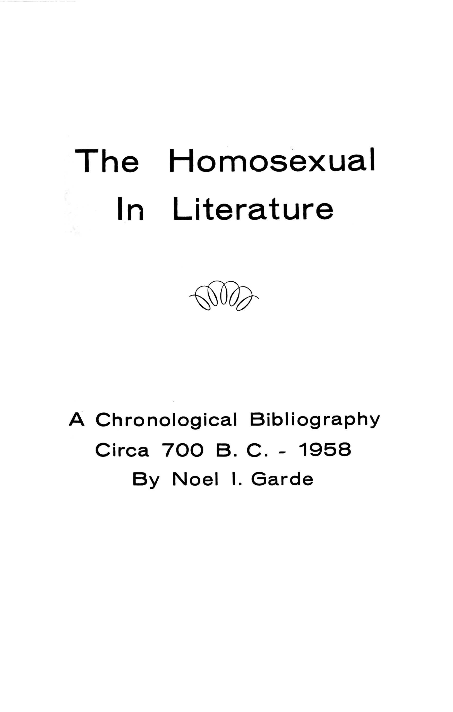 This bibliography provides a chronological listing of all known books in the English language, in the general field of fiction, concerned with male homosexuality, or having homosexual characters. It includes novels, short stories, short novels, poems, drama and fictionalized biography, plus a few other minor categories.