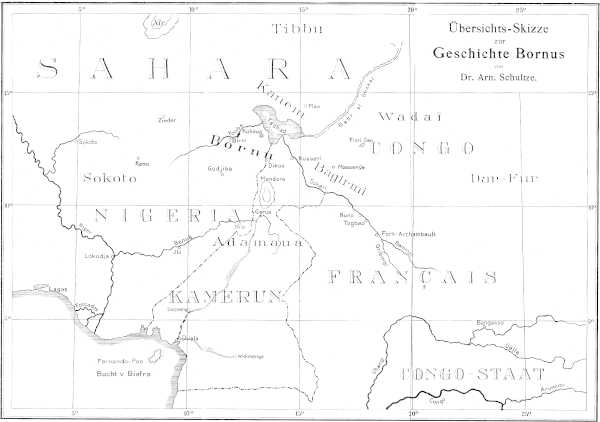This translation of Dr. Schultze’s monograph on Bornu has been undertaken in the hope that it may be of use and interest to those who, like the translator, cannot read German ‘with their feet on the fender’. The translator’s own knowledge of German is, in fact, almost nil, and the translation has been painfully worried out at odd times with the constant aid of a dictionary. In the work of revision, however, he has had the assistance of Alexander Siemens, Esq., and of various members of his family, who have an intimate knowledge of both English and German; to them the translator wishes to express his most cordial gratitude.[1] The translation is published by permission of Herr G. W. Baedeker, of Essen, owner of the German copyright.