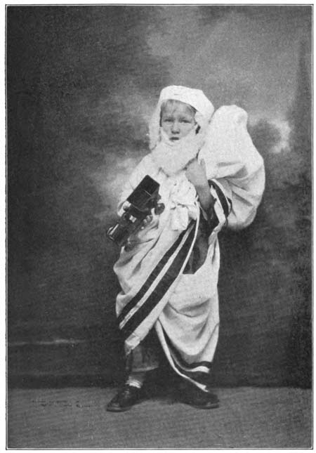 They reached their home steps. Jakie blustered up the steps ahead of Mamsy. He shoved open the door. [51]He ran to the fire-place to warm. Mamsy had piled hot ashes over the wood to smother the blaze. Jakie snatched the cotton beard from his chin, while Mamsy stirred up the fire. Jakie snapped the threads tacking the shawl and it fell to the floor. He jumped up and down clapping his hands, saying: