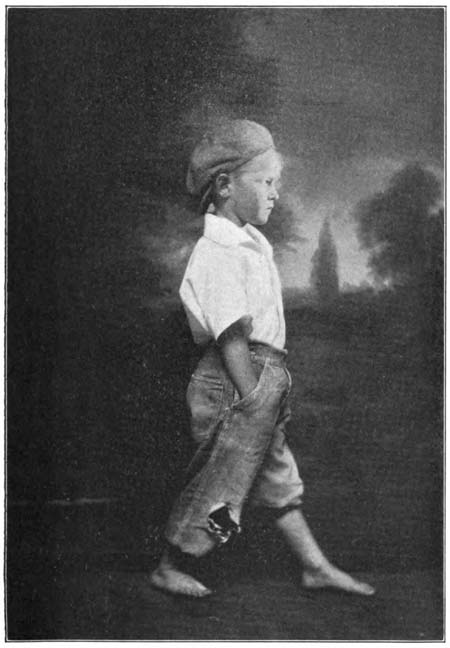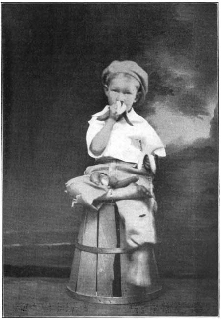 It seemed to Jakie that he had come miles and miles, but it was only two miles he had come. It was a long way to his small feet that he had walked and he was so glad now to be riding. He told the man he had a billy goat that he hitched to the wooden wheels for a wagon; told about his hickory nuts, and about their cow, as they rode along together to town. The man drove many streets out of his way to the business street of stores, which sold toys, and christmas trees, everything to make children happy! He told Jakie to keep straight on and on and he would see the stores. Jakie nimbly jumped down off the wagon. The man held his money for him, until he leaped to the ground and held his faded cap with both hands for the man to drop his money into it. He crammed the money [18]into his breeches pocket, waved good-bye to Mr. Foster, who carefully instructed him to wait at the store that had a picture horse in the window,—after Christmas Santa Claus gave him his present, and he would take him back home. The man drove away in another direction to deliver his wood, and Jakie ran down the street toward the stores. He was afraid to wait, Christmas Santa Claus might give away all those presents to those children running to him, before he got there. He passed a fruit-stand. A big bunch of bananas dangled over-head. He halted. He bought half-dozen. The man let him sit on an empty-fruit-basket turned bottom upwards! Jakie clambered on it and crossed one foot on his knee to make “a lap” to hold his bananas. He peeled two, holding one in each hand and stuffed his mouth entirely too full for digestion. But he was hungry; he had left home without any breakfast, and he was in a hurry! He ran onward and saw crowds and crowds of people on both sides of the street. He stared at the folks he saw expecting to find big, fat, jolly old, Christmas Santa Claus, somewhere in the crowds on the side-walk. The picture showed him on the street and the children rushing to him. On and on he walked looking eagerly this way and that way. He would recognize him in a minute, from his picture. He stopped before shop-windows to stare at the wonderful toys, trains, flying machines, bicycles, everything for boys,—and he wished he had every one of them. He was growing tired, he was weary, his little heart was feeling down cast. He stopped and asked some boys “Where’s Christmas Santa Claus?” They laughed at him, and winked at each other saying: “Go ahead he’s down the street!”