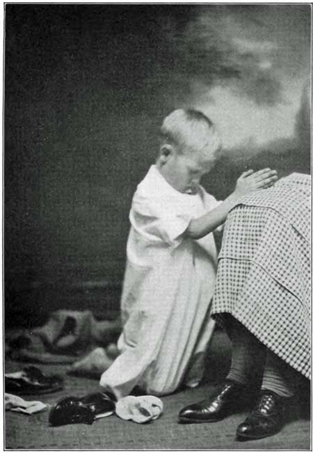 “You send the splinters and I send the turkey.” Jakie was satisfied. He wanted to rush out in the dark to the woodpile to hunt for a fat stick. Mamsy persuaded him to wait until to-morrow. He was sleepy and shed off his everyday clothes for his “nightie” and knelt down at Mamsy’s knee to say his evening prayers. He folded his hands together and bowed his head. His sweet voice said aloud: “God bless my Mamsy, God bless me and make me a good little boy, so I will go to my Mama in heaven. God bless my Big Friend, for Jesus’ sake amen.”