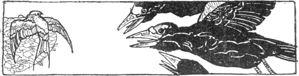 Hollók voltak; egy lármás hollótársaság, mely kiáltozva és veszekedve indult zsákmány után. A szegény huszár szíve összeszorult: ha a vad martalócok észreveszik, el van veszve. Egy vén holló, kinek feje már kopaszodni kezdett, most meglátta a baba aranyhimzésü ruháját. Tolvaj szemei csillogtak a kapzsiságtól, s örömkrákogással esett neki…