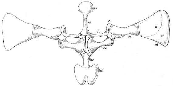 34 Dugès, l.c., p. 61, regards the cartilaginous laminae as os episternale and proc. xiphoideus, and the two bones e.s. and h.s. (Fig. 24) as sternum.