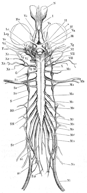 60 [Observers have differed considerably as to the relations of this nerve: Volkmann describes it as the first nerve of the neck, and describes a ganglion on its dorsal root; Vogt denies the presence of this ganglion, and regards it as a true cranial nerve; Stannius asserts that no ganglion exists, and holds the nerve to represent the first two spinal nerves; Wyman describes the two roots and regards it as a spinal nerve; Hoffmann regards this nerve as the second spinal (N. spinalis II); Fürbringer as the representative of two spinal nerves; de Watteville describes two roots and names it first spinal nerve.—Trans.]