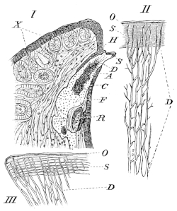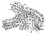 73 A transverse section through the mucous membrane of the fundus of the stomach of Rana esculenta is shown in Plate II, Fig. 187. Alcohol preparation, doubly stained with carmine and anilin blue. After Biedermann. (Obj. II, Syst. 7, Hartnack.)