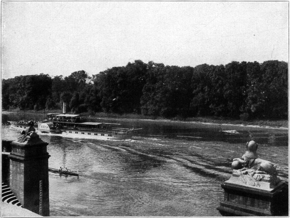 Nun entfaltete hier August der Starke seine hochfliegenden Pläne als Baumeister. Auch in Pillnitz wirkten in seinem Sinne seine Meisterarchitekten Pöppelmann und Longuelune und deren erprobte Gehilfen. Die Bauleitung wurde dem in solcher Tätigkeit wohl bewährten General Grafen Wackerbarth übertragen. Eine Darstellung der Baugeschichte in allen ihren Einzelheiten kann nicht unsere Aufgabe sein. Wir verweisen auf die mit Plänen und Ansichten reich ausgestatteten Arbeiten von A. v. Minckwitz und Cornelius Gurlitt. Die Bautätigkeit begann mit dem Abbruch der Schloßkirche. Das neue Gotteshaus wurde 1723 bis 1725 an der Weinbergslehne errichtet; zu seiner Ausstattung dienten Einrichtungsgegenstände des älteren Gebäudes. Noch heute sind in der »Weinbergskirche« die schönen Grabdenkmäler einiger Mitglieder der Familien Losz und Bünau zu sehen. 1925 beging die Gemeinde Pillnitz das zweihundertjährige Jubiläum ihres Gotteshauses, das am 11. November 1725 eingeweiht worden war. 1720 bis 1721 entstand auch das sogenannte Wasserpalais, das damals als orientalisches oder indianisches Lustgebäude bezeichnet wurde. Es ist jenes noch heute von allen Dampfschiffreisenden [16]angestaunte Bauwerk in einem pseudo-ostasiatischen Stil mit der großartigen Hafentreppe. An ihr schaukelten sich einstmals, freilich erst seit 1744 nachweisbar, die künstlerisch ausgestatteten Gondeln mit ihren bunt gekleideten Führern; mit dem Weggange der fürstlichen Herrschaften von Pillnitz sind sie wohl für immer verschwunden. Dagegen grüßt uns an der Elbseite noch einer der wenigen Überreste aus dem älteren Schlosse, nämlich jener Sandsteinobelisk aus der Zeit um 1650, der mit einem verlorengegangenen zweiten Obelisken einst vor der Ostfront des Loszschen Bauwerks stand und nach dem Brande von 1818 auf den »Löwenkopf«, den Unterbau eines früheren Lusthauses an der Elbe, gebracht wurde, der seinen Namen von einem an der Stromseite in das Mauerwerk eingelassenen Löwenhaupte, auch aus der Mitte des 17. Jahrhunderts, bekommen hat. 1722 und 1723 wurde auf der nördlichen Seite des Lustgartens, symmetrisch zum Wasserpalais und ebenfalls im chinesischen Stil, das Bergpalais errichtet.