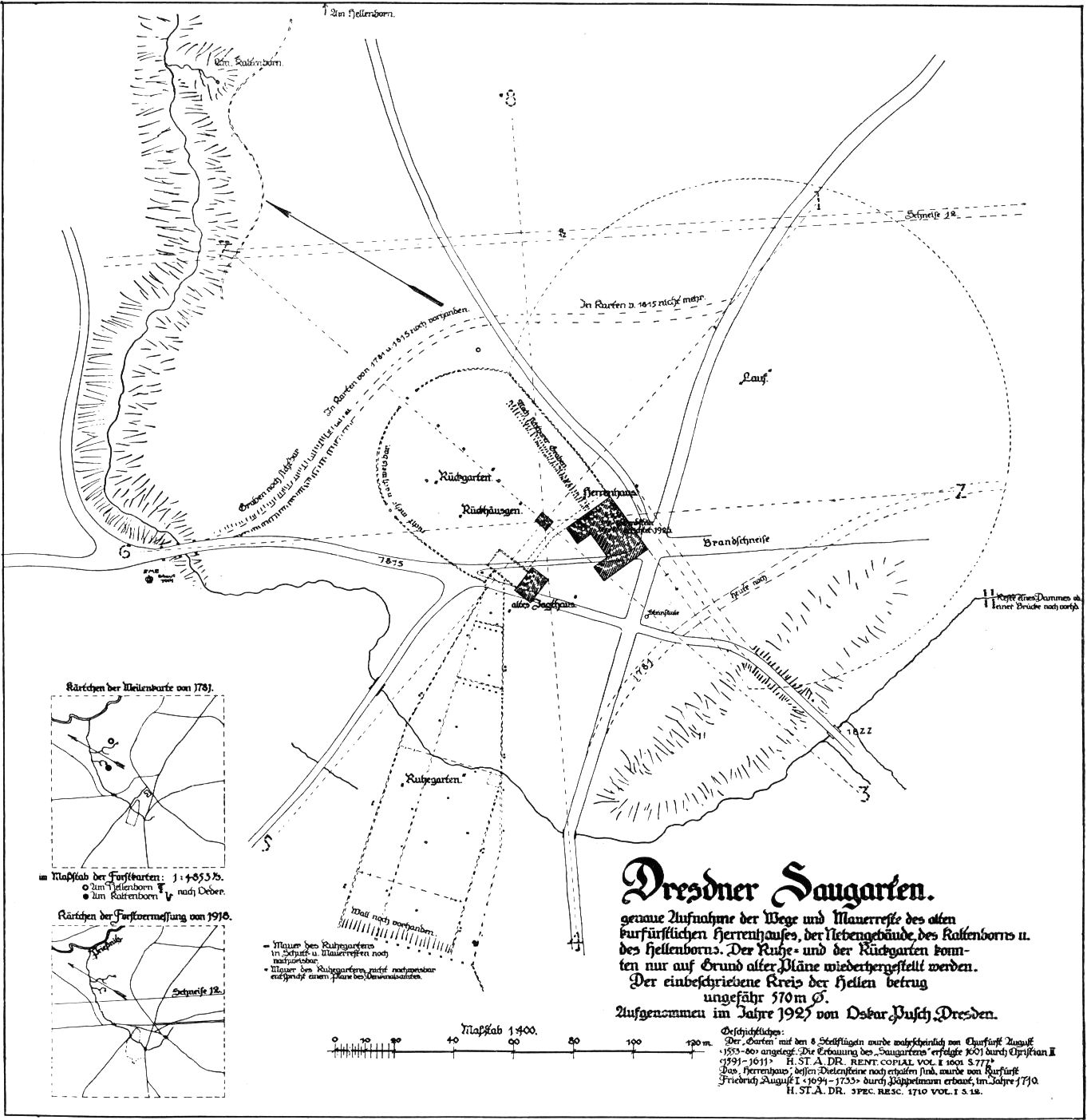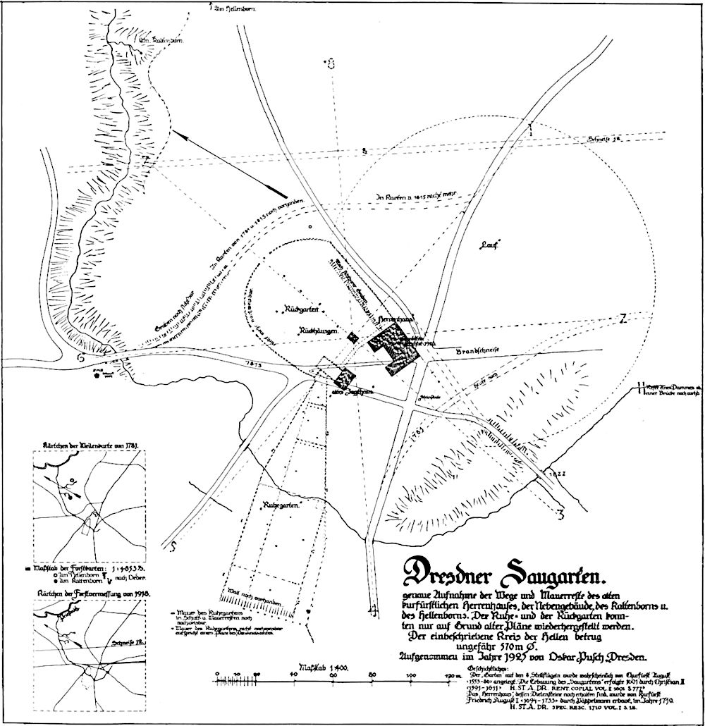 Wann jene Ursiedelung am Elbufer abgebrochen wurde, sagt uns keine Urkunde. Wahrscheinlich aber geschah es damals, als die ritterlichen Herren über Pillnitz von ihrem ersten Sitz an der Berglehne, dem alten Schloß, ins Tal hinabzogen und dort einen neuen stattlichen Wohnbau errichteten. Das mag wohl schon vor fünfhundert und mehr Jahren geschehen sein. Viel später erzählen uns Akten von dem Aufgehen anderer Flurteile in den Schloßbereich. So wurden 1721 nördlich vom Bergpalais fünf Häusler- und Gärtner-Nahrungen ausgekauft und zum Schloßpark geschlagen, und 1785 und 1790 mußten abermals neun Häusler ihre Heimstätten verlassen, die dem mit Treibhäusern ausgestatteten »Holländischen Garten« angegliedert wurden.