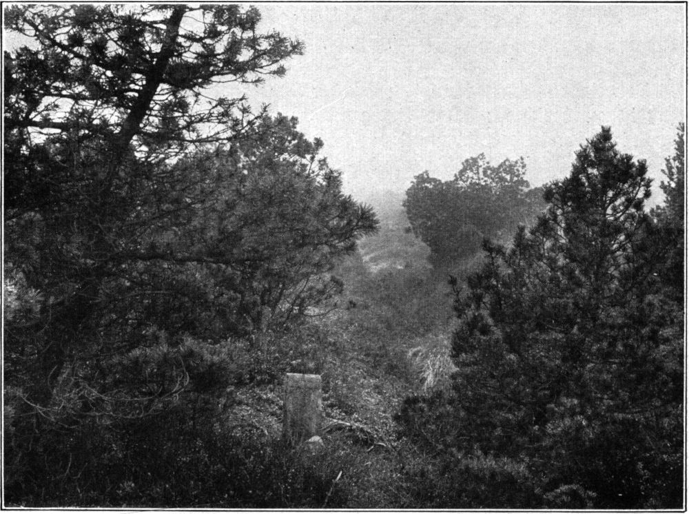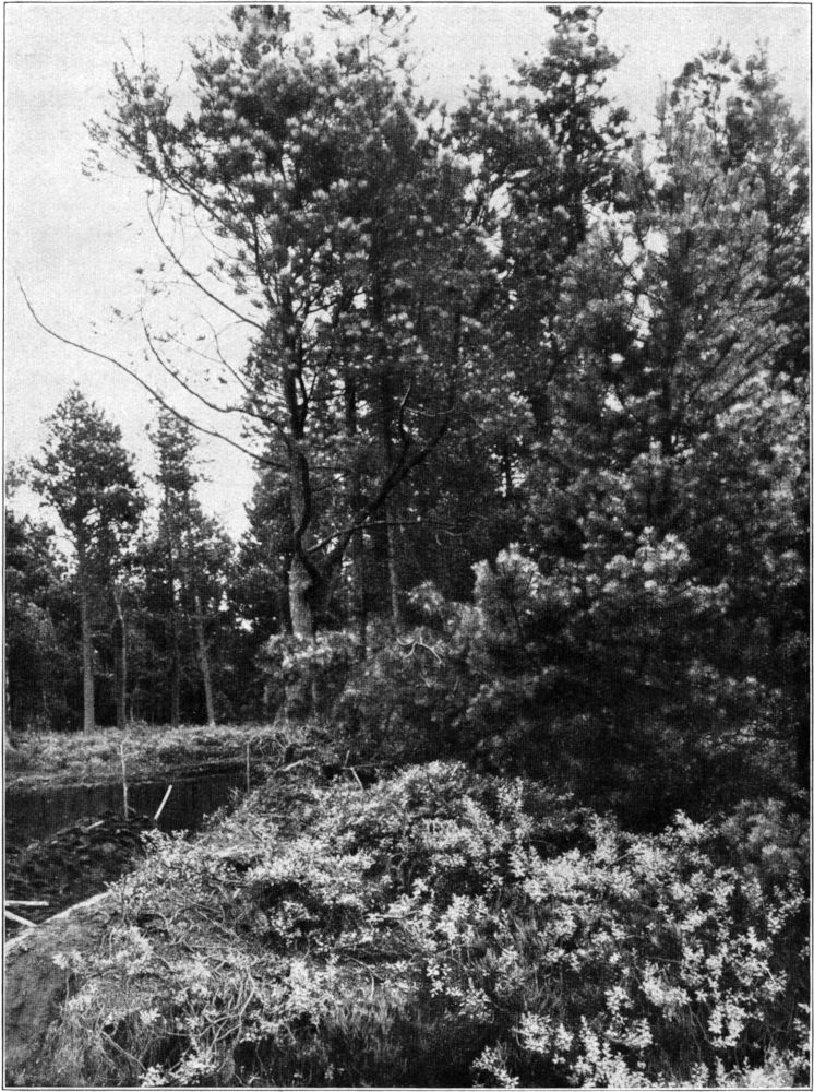 Ein solches Hochmoor gedieh, so lange die jährlichen Niederschlagsmengen reichlich flossen. Ziemlich unvermittelt scheint aber in ganz Mitteleuropa eine Trockenperiode, vielleicht eine Steppenzeit, eingetreten zu sein. Das Wachstum des Moosmoores stockte, und der Moostorf zersetzte sich durch Lufteintritt zu einer dunkelbraunen, strukturarmen Masse. Wie lange diese Trockenheit angehalten hat, ist nicht zu ermitteln. Sicher ist aber, daß auf dem trocken gelegten Moore Heidekraut und Wollgras Platz fanden, die allmählich, wahrscheinlich [55]bei Wiedereintritt reicher Niederschläge, zu einer mulmigen Torfschicht zusammenschwanden. Dieser stark zersetzte Torf wird von Weber Grenzhorizont genannt und findet sich nicht bloß in den norddeutschen und schwedischen Mooren, sondern auch in den Höhenmooren der Mittelgebirge und des Alpenlandes. Bei den Höhenmooren, also auch im sächsischen Erzgebirge, scheint aber anstelle von Heide- und Wollgras ein Trockenwald von Birken aus der Umgebung eingedrungen zu sein, so daß Schreiber, der Erforscher erzgebirgischer Moore, diese Grenzschicht als jüngeren Waldtorf bezeichnet. Auf diese Schicht baut sich, begünstigt durch einsetzende Niederschlagsperiode, ein neues Hochmoor mit fast reinem Sphagnumbestand, aus dem der gelbgefärbte, wenig zersetzte jüngere Moostorf hervorging, dessen Entstehung überall dort noch andauert, wo nicht aus natürlichen Gründen, oder, durch Menschenhand verursacht, Austrocknung die Moosbildung verhindert. An den trockneren Randgehängen unserer Erzgebirgsmoore finden wir als Charakterstrauch die vielästig vom Boden aufstrebende Moorkiefer, eine Unterart uncinata der eigentlichen Bergkiefer Pinus montana (Abb. 18), während in den norddeutschen Zwischenmooren die Krüppelkiefer Pinus silvestris forma turfosa erscheint.