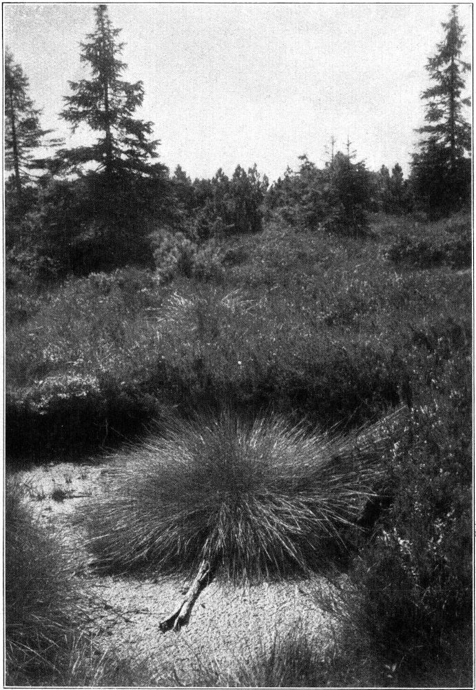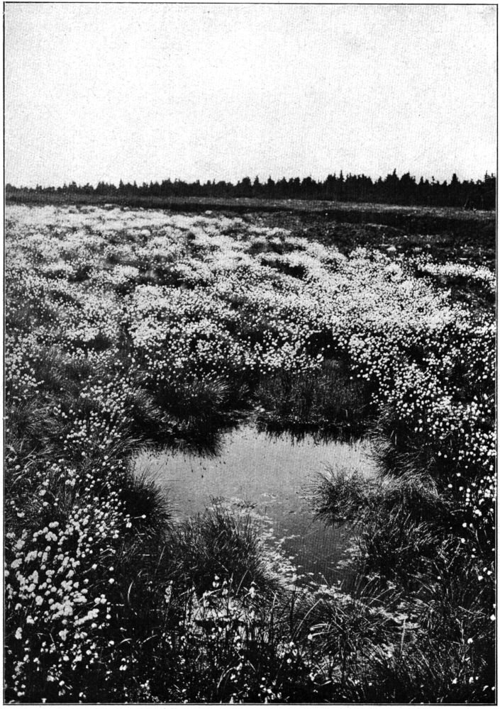 Bei der überreichen Feuchtigkeit, bei der geringen Durchlüftung und bei dem Säuregehalt können im Moore nur ganz bestimmte Pflanzenarten gedeihen (Abb. 10). Solche Pflanzen sind unter den Holzgewächsen die flachwurzelnden und wenig unter dem Boden hinstreichenden Heidesträucher, welche auch durch ein Zusammenwirtschaften mit Pilzmyzelien (Mycorrhiza)[2] zum Nahrungserwerb aus solch humusreichen Böden befähigt sind. Außerdem gehören hierzu mit inneren Luftreservoiren versehene Sauergräser, Binsenarten und Schachtelhalme und die nur mit feinen Haftfäden die Bodenoberfläche durchdringende Kleinwelt der Moose. Unter letzteren seien die Braumoose (Hypnum), die Haarmoose (Polytrichum) und ganz besonders die Torfmoose (Sphagnum) hervorgehoben. Bei den Sauergräsern möchte ich an die sumpfgewohnten Riedgräser (Carex) mit ihrer Ausläuferbildung, und an die Wollgräser (Eriophorum) mit ihrer Blatthorstbildung (Abb. 11) erinnern. Gerade die Wollgräser verraten ja mit dem reinen Weiß ihrer wehenden Fruchtfahnen besonders eindringlich mooriges Gelände (Abb. 12, aus Naumann, A.: Praktische Wege des Heimatschutzes S. 14).