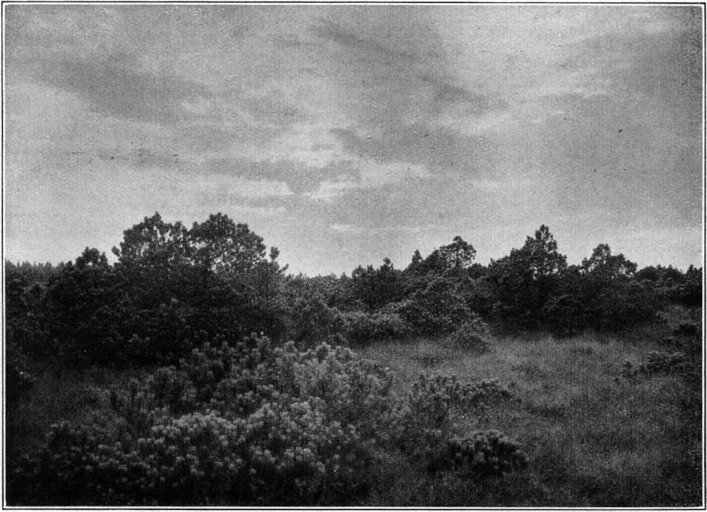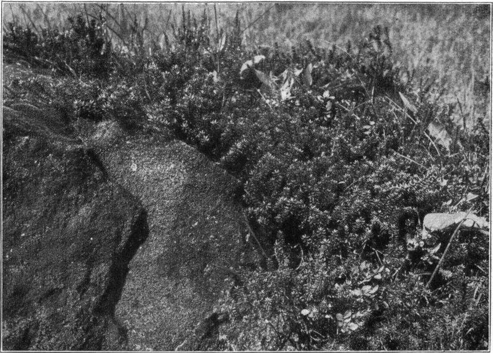 Flachmoore begleiten meist Stromtäler. Zu ihnen darf man rechnen den Spreewald, das Oderbruch, das Lebamoor in Pommern und die ausgedehnten Erlenmoore am kurischen Haff. Sie alle werden teils abgebaut auf Brenntorf oder wurden und werden umgewandelt in Kulturland. Austrocknende Moore werden meist in Besitz genommen von Sträuchern: in Norddeutschland östlich der Elbe von Strauchbirke (Betula humilis), von Gagelstrauch [49]Myrica Gale, von Sumpfporst; oder von Zwergsträuchern: Trunkelsbeere Vaccinium uliginosum, Heidel- und Preißelbeere, auch von Krähenbeere Empetrum nigrum (Abb. 13). Vor allem das Heidekraut (Calluna vulgaris) mit seiner unverwüstlichen Lebenskraft überzieht schließlich jene Moorgebiete besonders bei sandig-grusigem Untergrund, während in bruchigem Gelände, zumal im Nordwesten unseres Vaterlandes, in der Lüneburger Heide, die reizvolle Glockenheide Erica tetralix sich ansiedelt, und der Wacholder (Machandelbaum, Knisterbusch) Juniperus communis seine dunklen Säulenpyramiden baut, um der Landschaft einen lieblich herben Reiz zu verleihen.