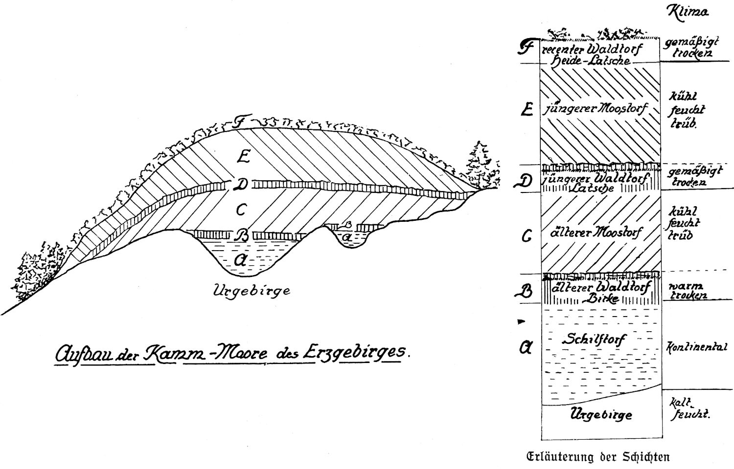 Von solchem Formationswechsel, herbeigeführt durch den Wechsel klimatisch feuchter und trockener, kühler und wärmerer Erdperioden, gibt uns das Anstichbild eines Moores, das sogenannte Moorprofil (Abb. 14), anschauliche Kunde.
