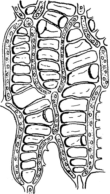 Auf den schließlich entstehenden Standmooren war neue Siedelungsmöglichkeit geschaffen. Strauchvegetation aus niedrigen Weiden, auch die Erle faßten Fuß, und Bruchwälder entstanden, die mit ihrem feuchtkühlen Schatten dem Mooswachstum Vorschub leisteten, bis schließlich der Bruchwald unter dem Moosansturm erstickte, umbrach und der Vertorfung anheimfiel. Wieder erhöhte sich dadurch der Boden und der Bruchwaldtorf entstand. Neue Pflanzensiedlungen konnten natürlich mit ihren Wurzeln nicht mehr zu dem nährstoffreichen Grundwasser gelangen, denn die aufgehäuften Schichten hinderten daran. Es mußte das nährstoffarme Niederschlagswasser zum Leben und Wachstum genügen. Solche genügsame Holzgewächse waren Kiefer und Birken. Es entstand ein Übergangswald, beziehungsweise ein Zwischenmoor, dessen Vorhandensein [54]nicht in allen Moorprofilen nachweisbar ist. Auch dieser Wald wurde von Scheuchzeria- und Riedgrasbeständen, sowie durch Moossiedelungen besiegt und schließlich herrschte das Torfmoos, welches schon bei einer Schichthöhe von dreißig Zentimetern Kiefernwald ersticken kann. Es herrschte durch seinen porösen Bau in Blatt und Stengel (Abb. 17), welcher imstande war, große Niederschlagsmengen festzuhalten, Ammoniakgase in sich zu verdichten, vor allem aber trotz des vertorfenden unteren Teiles oben freudig weiterzuwachsen. Derart bildete sich ein uhrglasförmig gewölbtes Hochmoor mit trocknerem Randgehänge und seeartigen Blänken (Mooraugen), die sich aus den vom wassersatten Moose nicht aufgenommenen Niederschlägen sammelten. An dem trockneren Randgehänge erheben sich vielfach kleine, oft nur quadratmetergroße Heidehügel, sogenannte Bulte. In den dadurch entstehenden Tälchen sammelt sich ebenfalls Ablaufwasser an, sie werden zu Schlenken. Oft auch bilden sich zum Rande gehende tiefere und längere Rüllen, in welchen bräunliches Moorwasser abfließt. Fließendes Wasser aber versorgt die Rüllenränder mit immer neuen Nährstoffen, so daß sich hier eine anspruchsvollere Hochstaudenflur ansiedelt.