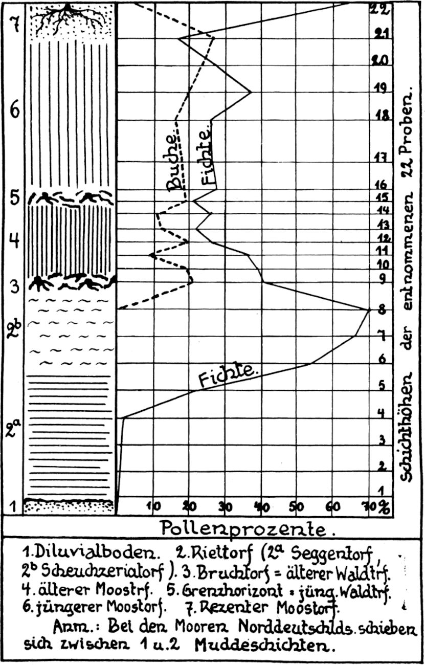 Der Blütenstaub der das Moor umgebenden Waldbäume wurde, wie noch heute, so vor Jahrtausenden alljährlich in ungeheurer Menge erzeugt, so daß er, von den Bergwäldern verweht, aus ziemlicher Ferne auf die Moorfläche gelangen konnte. Werden doch von der Fichte auf eine Entfernung von vier Kilometern noch vierzehn Prozent, bei Birke noch elf Prozent des Gesamtpollens durch den Wind vertragen. Auf den baumlosen Farör-Inseln hat man sogar Baumpollen beobachtet, der aus einer Entfernung von vierhundert Kilometern stammen mußte.