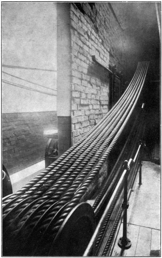 Rope driving has practically revolutionized the construction of modern mills since ropes are used not only as a direct drive from the rope pulley on the engine or motor shaft, but at many intermediate places, and have replaced many installations of wheel-gearing. These mill-driving ropes, which are invariably from 1½ to 2 in. in diameter, are made extensively of cotton, hemp or 107manila. In exceptional cases more than forty such ropes are used on the same pulley. The frontispiece illustrates a rope drive in which seven ropes each of 1¾ in. diameter, are utilized on the shaft of a motor for conveying the motion to a mill shaft seen in the distance. Other ropes are seen in the next rope alley. Somewhat similar ropes, but of a smaller diameter, are used for hauling in the baling press illustrated in Fig. 15.