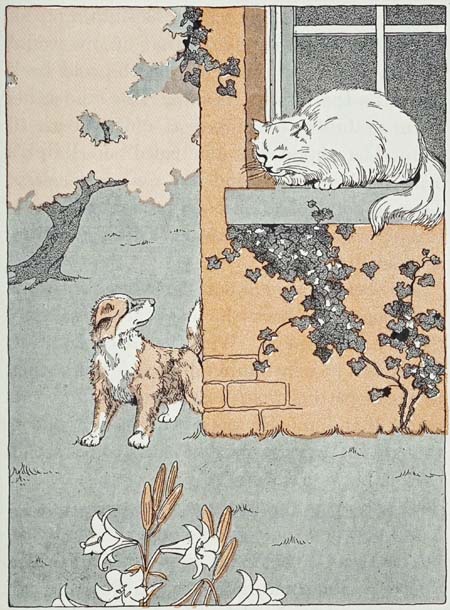 Fluff, for that was the cat’s name, was as much astonished as Peter was, at what she was encountering. This was something unlike anything [14]she had ever seen before. Something told her it was akin to her old enemy, the dog, but how harmless this one seemed! Nothing but the wag of his ridiculous little tail was at all doglike.