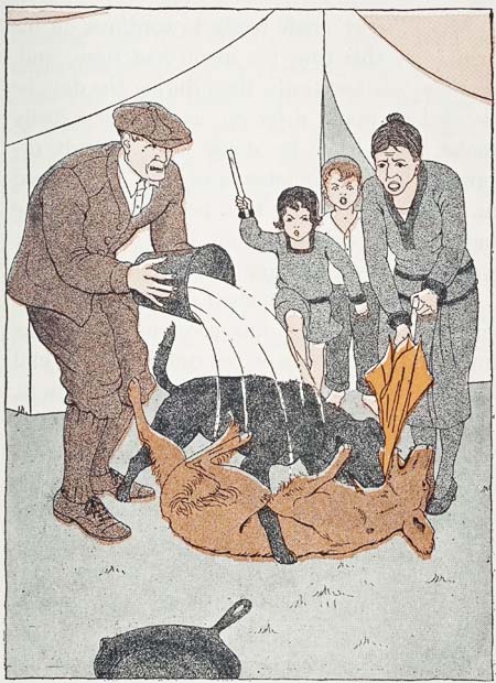 Susie had tried to train Pete to be polite, [6]and to observe the Golden Rule in his conduct toward cats and other animals less fortunate than himself. His father had given him a cuff on the side of the head when he found him running off with Betty’s shoe, and told him that “dogs who wished to grow up into leading citizens in dogdom didn’t steal young ladies’ shoes and chew the toes off them.” Then he made Pete take the shoe to his mistress, lay it at her feet, and wag his tail in apology.