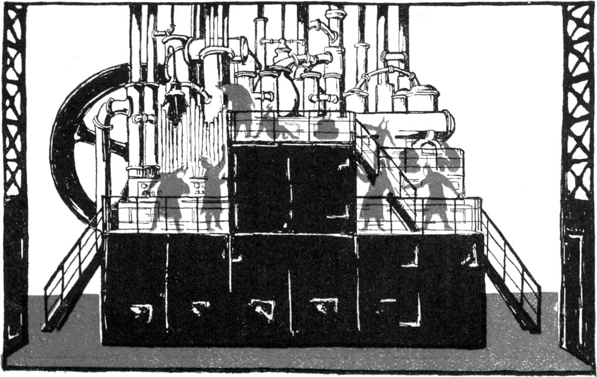 Mindezek alatt a harang és az orgona szakadatlanul szól a gép belsejében, ugyancsak szünetlenül hallani a zugást, morajlást, tompa dübörgést.