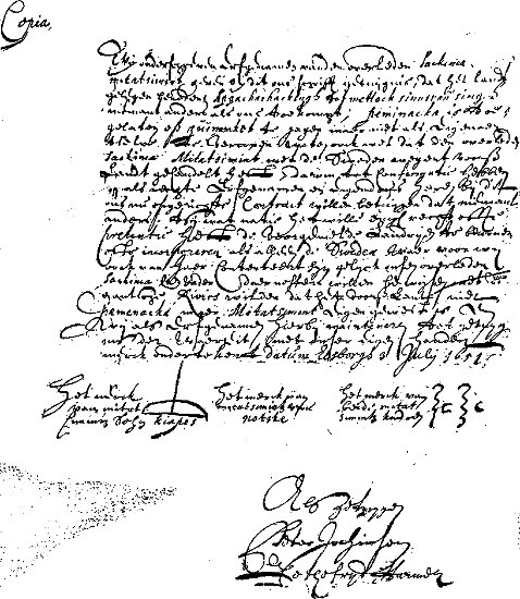 [35] Elswick says: “Dreij Uhr nachmittag zogen die Hollander ein und unsere Völker mit fligender Fahne, slagende Trummell, rürende Pfeiffe, brandende Leüte sampt Ober- und Unter-gewehr, etc., auss dieser Fortresse Christina.” Relation.