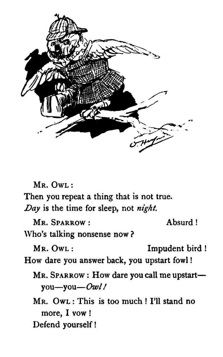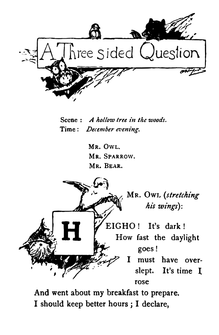 Dear Mr. Owl and Mr. Bear, good-bye! [Exit.