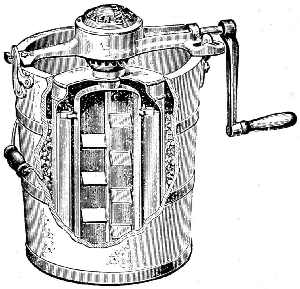 “Alexander the Great is said to have been very fond of iced beverages, and one of our modern varieties, the Macedoine, it is said, was named for the great Macedonian. Snow and ice were used at the table in the court of Henry III of France in the hot summer months. The Italians, it is claimed, made the first improvement in the original method of cooling, which improvement was to dissolve saltpetre in water and pour a little of the solution in with the snow and ice surrounding the dish to be cooled. Later, it was found that better results were attained by dropping the saltpetre directly into the snow and ice, and at the same time revolving the vessel containing the substance to be chilled. By this means the mixture in the vessel could [289]be brought to a fairly solid state. Wines were commonly iced in this way, then water, sweetened and flavored with various juices or other flavorings, was made into a sort of water ice. Water ices and such refreshments are still the rule in the Orient, while ice-cream, as we know it, is rare.