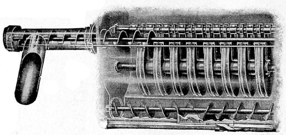 | Fig. 19. | —Freezing discs of freezer shown in Figs. 17 and 18. The scrapers for removing the frozen ice-cream from the discs and the screw to force it out of the delivery spout are shown. (Courtesy of Creamery Package Manufacturing Co., New York City.) | 90 |