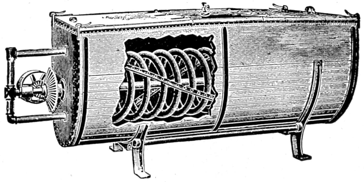 | Fig. 20. | —A pasteurizer or ripener used as an ice-cream mixer. Strips are attached to the coils to prevent the settling of the sugar on the bottom | 90 |