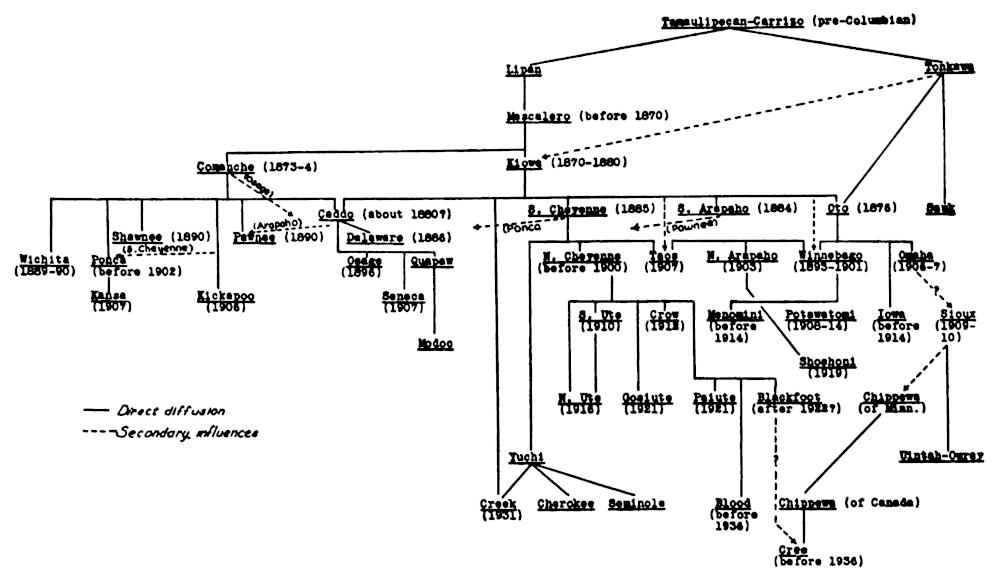 In a study of this scope one necessarily incurs considerable debts to colleagues for aid generously given and gratefully received. The notes of James Mooney on Kiowa, Comanche, and Tarahumari peyote, deposited in the Bureau of American Ethnology, as well as manuscripts by Frances Densmore on Winnebago, and Dr. Truman Michelson on Sauk and Fox peyote, were made available through the generosity of Dr. Matthew Stirling, to whom I express particular thanks. Mrs. Elna Smith very kindly lent further Bureau of American Ethnology material which had been in her care. Mr. D. F. Murphy of the Indian Office amplified my Osage notes, and Mr. John Collier, Commissioner of Indian Affairs, [4]has been generous with information of legal and administrative nature. To Donald Collier, student at the University of Chicago, and Ing. Luis Híjar y Haro of Mexico City, I express appreciation for bibliographic items, as well as to Dr. Ralph Beals of the University of California at Los Angeles. Richard Schultes, student at Harvard University, who was with me for an ethnobotanical study during several weeks of my second summer of work, has also been generous in giving help on bibliographic as well as botanical and pharmaceutical matters. Dr. E. A. Hoebel of New York University made available his notes on Northern Cheyenne and Comanche peyote. Dr. Ruth Benedict of Columbia University and Dr. M. E. Opler of the University of Chicago have aided with Mescalero Apache notes, and the latter has very generously lent valuable manuscript notes on Tonkawa, Carrizo and Lipan peyotism. Dr. Frank Speck of the University of Pennsylvania was fertile with suggestions during the second period of field work, and since its completion has contributed important Delaware material. Mrs. Erminie Voegelin, student at Yale University, kindly lent her voluminous notes on Shawnee peyote, as did Mrs. Anne Cooke for the Ute, and John Noon, student at the University of Pennsylvania, for the Kickapoo. Dr. A. H. Gayton kindly lent an interesting paper on datura. While the present paper was still in proof form, Dr. Leslie A. White of the University of Michigan and Dr. Fred Eggan of the University of Chicago generously lent material on Taos and Northern Cheyenne peyotism respectively.
