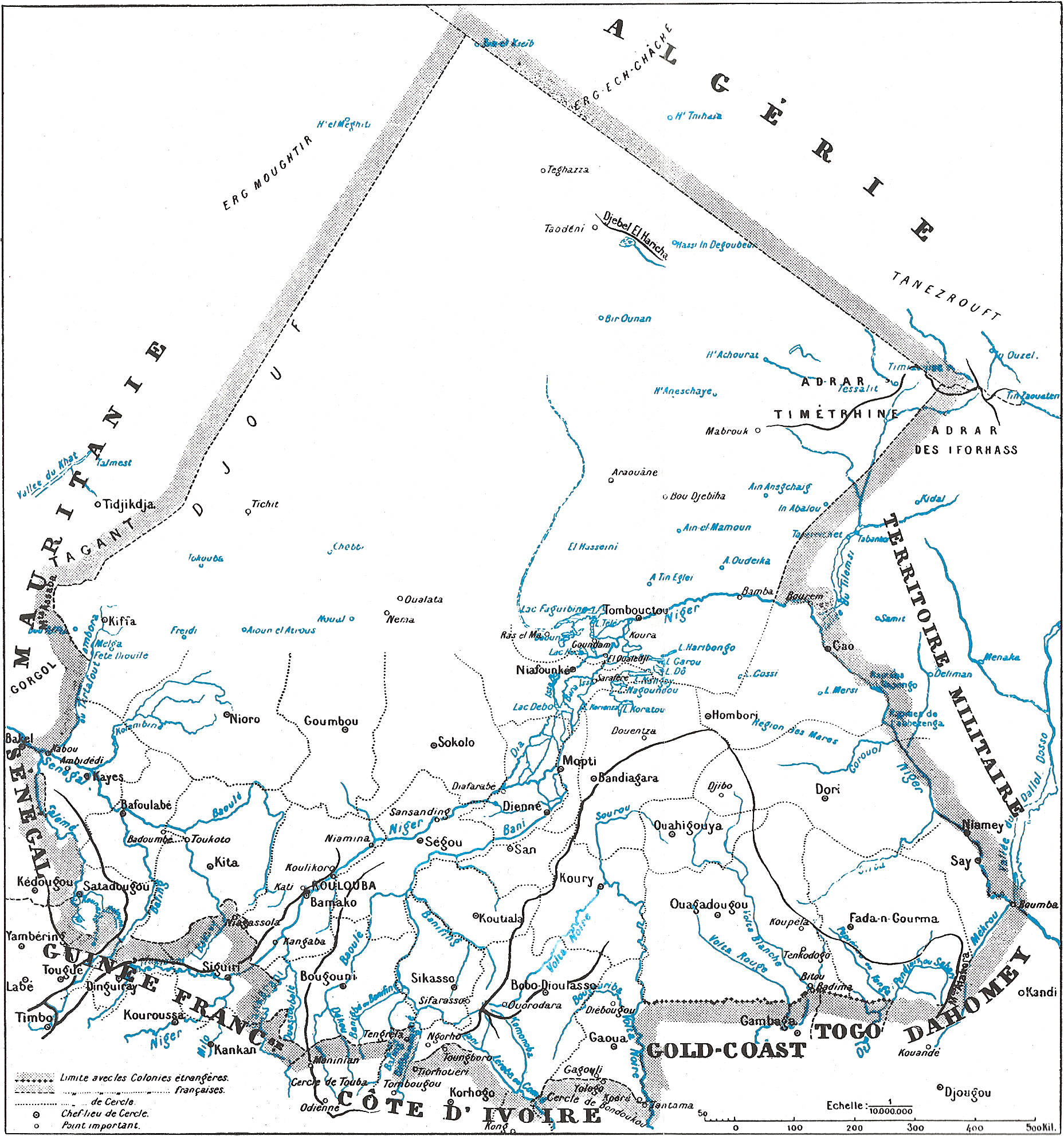 Telle est dans son ensemble l’organisation qui permet, avec à peine 500 officiers ou fonctionnaires français et une force armée d’environ 4.500 noirs tout compris, troupes régulières,[10] milices et gardes-cercles, de faire régner l’ordre et la sécurité parmi 5.000.000 d’indigènes épars sur un territoire qui, de la Falémé au Tchad, mesure plus de 2.800 kilomètres et qui, du Nord au Sud, en y comprenant la zone saharienne dont la police nous incombe, en a rarement moins de 1.300. Nous y percevons, en additionnant les trois budgets qui fonctionnent dans la Colonie, budget local, budget annexe du Territoire Militaire, budget annexe du chemin de fer, près de 12 millions de revenus, sans parler des recettes douanières qui appartiennent au budget général.