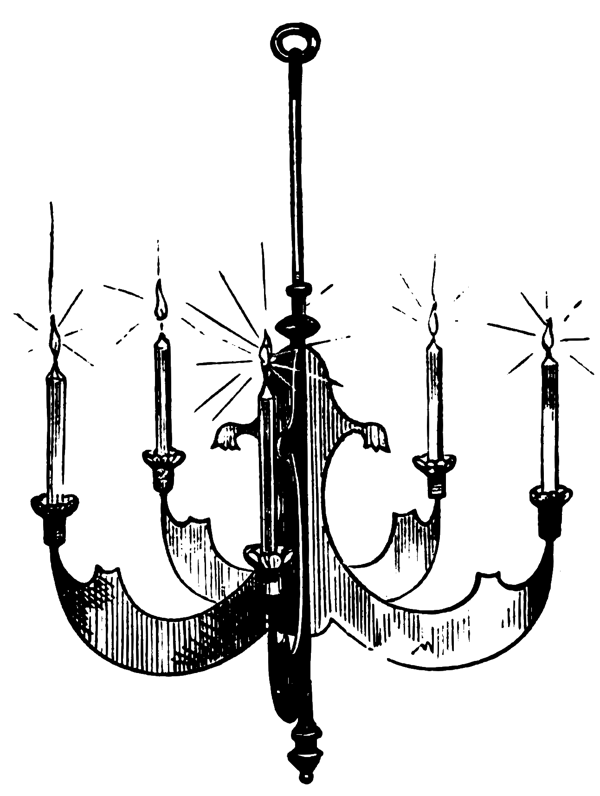 The ingenuity of later inventors has added new incidents to the trick. One is the production of a large five-branch chandelier, with lighted candles, as shown in Fig. 33. The central rod, or stem, of the chandelier is telescopic, one part sliding within the other. The five arms, which are slightly unequal in length, work on this as a pivot, folding flat one against the other, as shown in Fig. 34, and in that condition occupy but very little space. The candles, the wicks of which are touched with paraffin or turpentine, to cause them to ignite readily, are lighted with an ordinary lucifer under cover of the portfolio, before the chandelier is expanded into the shape in which it is afterwards produced.