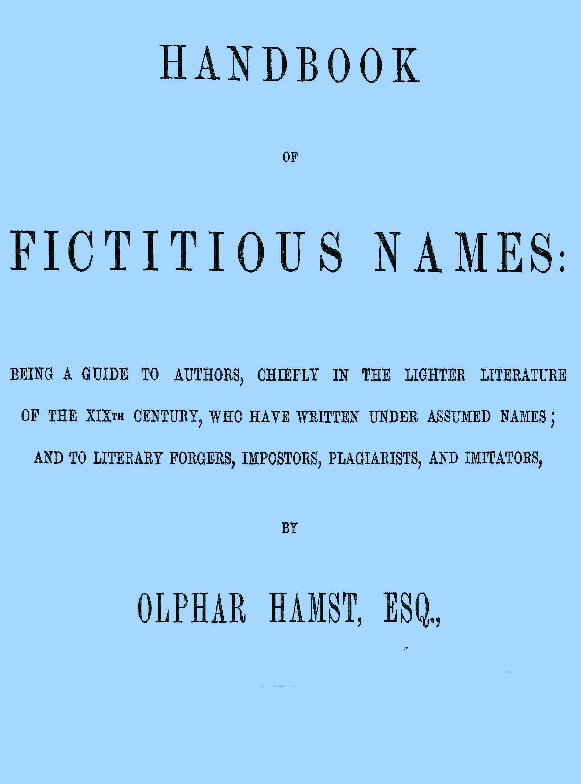 We have not confined ourselves to English and American pseudonyms: in fact, our plan is rather a wide one, for we include Alexander Dumas and George Sand: Boz, illustrated by Phiz: S. G. O.: The Times’ Bee-Master: Cham and * * * (The Abbé).