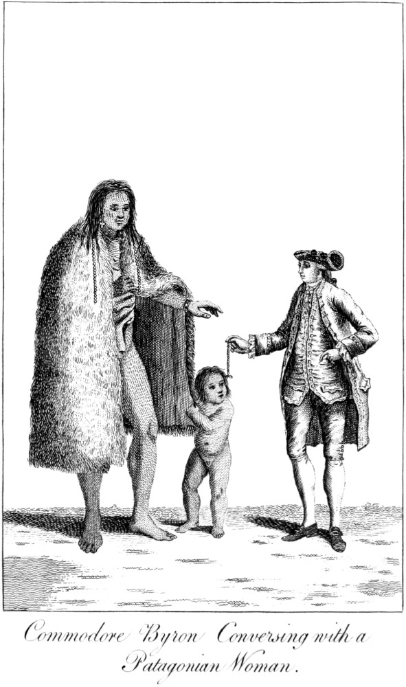 10Mr. Byron now advanced alone, but as he approached, the Indians retreated; he therefore made signs, that one of them should come forward, which was complied with. The person who advanced appeared to be a chief, and was very near seven feet in heighth: round one of his eyes was a circle of black paint, and a white circle round the other; the rest of his face was painted in streaks of various colours. He had the skin of a beast, with the hair inwards, thrown over his shoulders. The Commodore and the Indian having complimented each other, in language equally unintelligible to either, they walked together towards the main body of the Indians, few of whom were shorter than the height abovementioned, and the women were large in proportion. Mr. Byron made signs for them to sit on the ground, which they did, chanting in a most serious and melancholy tone. The eyes of any one face were never painted with the same colours; some being white and red, some black and red, and some black and white: their teeth were white and even; they were all dressed much alike; but that some of them wore a sort of boots, having a spur of peaked wood fastened to each heel.