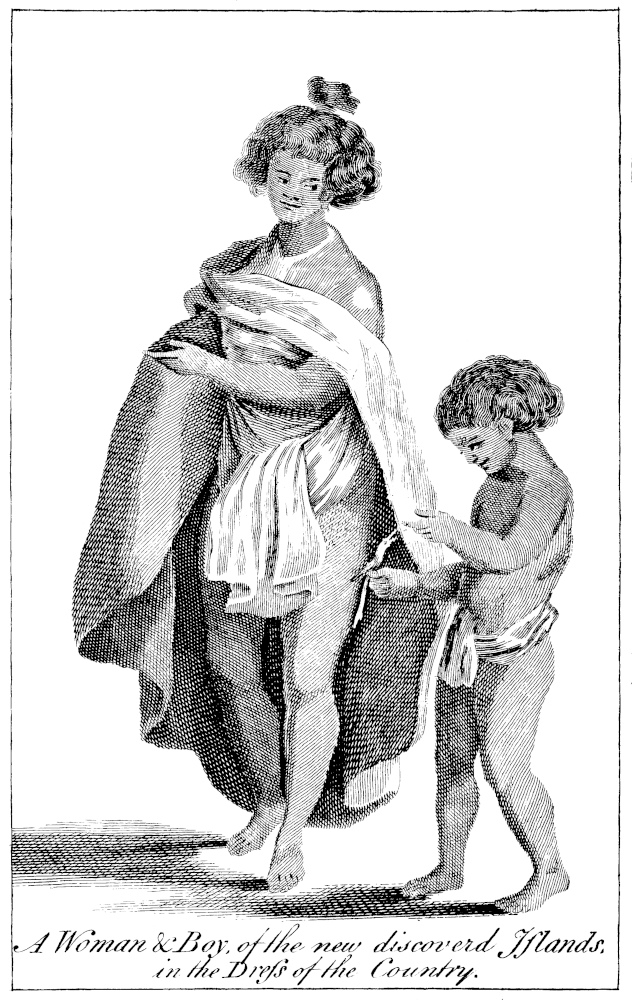 On Wednesday, June the 12th, they sailed to another island, and as they coasted along it, the natives, armed as those of the other islands, kept even with the ship for some leagues. They frequently plunged into the sea, or fell on the sand, that the surf might break over them, to cool and refresh themselves. The boats being near the shore, the crew made signs that they were in want of water; on which the natives pointed farther along the shore, where, when the boats arrived, they saw a number of houses, and whither they were followed by the Indians, many more of whom joined them at this place. The boats having got close in shore, and the ships laying at a small distance, a venerable old man, with a white beard, advanced from the houses to the beach, attended by a young fellow. Having made a signal for the other Indians to retire, he came forward to the edge of the water, pressing his beard to his breast with one hand, and holding a branch of a tree in the other. He now made a kind of musical oration, during which the people in the boat threw him some trifling presents, which he would neither take up, nor permit his attendant to touch till he had finished his harangue, when he walked into the water, and throwing the branch to the boat’s crew, he retired, and picked 40up their presents. Most of the natives having complied with a sign made for them to lay down their arms, one of the Midshipmen swam ashore; on which they flocked round him, admiring his cloaths; as his waistcoat pleased them most he gave it to them, which he had no sooner done, than one of them untied his cravat and ran away with it. He now thought it time to retreat to the boat, whither several of the natives swam after him; some bringing each a cocoa-nut, and others fresh water in the nut-shell. The boat’s crew had taken with them some shells of the pearl oyster, in order to learn of the natives how to procure some pearls; but they could not possibly make them comprehend their meaning. This island is situated in 14 degrees 41 minutes south latitude, and 149 degrees 15 minutes west longitude; and both the islands the Commodore called King George’s Islands, in respect to his Sovereign. In a lake belonging to the last island, two or three very large vessels were seen, one of which had two masts, with proper cordage.