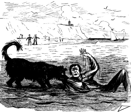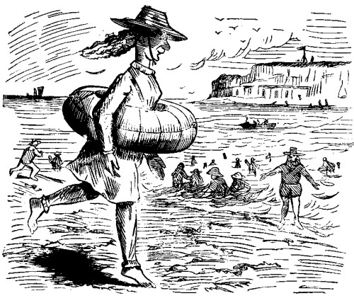 "WHEN YOU GO TO LONG BRANCH, DO NOT TAKE A NEWFOUNDLAND DOG WITH YOU. I BROUGHT ONE DOWN WITH ME HERE, AND WHENEVER I GO OUT TO TAKE A LITTLE DIP, THE FAITHFUL CREATURE WILL INSIST ON DRAGGING ME ASHORE."—Letter from a Friend. SUMMER AT SANDY POINT. Sandy Point, August 18, 1870. PRELIMINARY FLOURISHES. DEAR PUNCHINELLO:[1] Nature demands a change of air. Man needs rest. Invigoration is necessary to health. The throbbing brain must shut down on its throbbing. Hence second-class hotels, with first-class prices; hence hard beds, no gas, and many flies. I say—"Hence—flies," but as a general thing I notice they will not hence. WHERE TO GO. Those who are fond of flees may flee to the mountains. I know when I've got enough, and I prefer to surf it on the sea shore. Take the 3-1/2 A.M. train, and come to SANDY POINT. Everything here is sand as far as the eye can reach, or a horse and wagon, with a profane driver, can travel. The ocean laves the beach. The sea also is here. The tide comes in twice a day. This alone gives Sandy Point a great advantage over all other points on the coast. I rode up in the regular conveyance, and soon after my arrival found myself standing on the spacious and elegant piazza of THE CHARNEL HOUSE, a palatial structure erected by the late Mr. CHARNEL, who is said to have lavished an immense fortune upon it. Strictly speaking, he didn't lavish quite so much paint on the front as an advanced civilization had a right to expect; but within, everything, (including the clerk,) appears to have been furnished with an eye to LUXURIOUS COMFORT, Mr. SOAPINGTON, the genial landlord, Mr. RICHARD SOAPINGTON, Jr., the gentlemanly clerk, Mrs. SOAPINGTON, the accomplished hostess, and the lovely Miss CLARA SOAPINGTON, all greeted me with that hearty welcome, so dear to the traveller. SOAPINGTON said he was glad to see me, and, seeing that it was me, he would be willing to infringe on his inflexible rule, and would allow me to pay CASH IN ADVANCE. Madame S. was sorry she couldn't set me up a cot in the wash-room, but would be compelled to let me have a double front-room over the bar. I told her if the apartment had a practicable trap door I thought I could get along. RICHARD S., Jr., was sure he had met me before; and, as a friend, he would say the establishment was not responsible for valuables unless deposited in the safe. He would take my watch and jewelry to wear while I was there, inasmuch as HE WAS THE SAFE HIMSELF. The charming Miss S. didn't say anything, but she smiled, and looked such unutterable things from behind the blinds, that I expect to find it all in the bill. Everybody that can get a railroad pass should come to Sandy Point WHAT TO DO. Sit in the reading-room and look over the torn files of two daily papers a week and a half old; or study a hotel advertiser. THE SURF BATHING is magnificent. The prevalence of an unmitigated undertow renders it quite exhilarating for old ladies and invalids. Any one who is drowned will have every attention paid to his remains,—by the sharks. BOATING. Everybody boats. The ROWE Brothers are here, and sing on the water by moonlight. You can blister your bands at an oar, or bale out the boat, just as your taste inclines. As the life-preserver is a little out of repair, I stay on shore. FISHING. Everybody fishes. There are all varieties, from speckled trout and mackerel, up to conger eels, horse mackerel, and porpoises. Parties frequently come back with all the fishing they want. If absent a week on a trip, they can make arrangements to have their board run on just the same. DRIVING. Everybody drives. The roads are of unsurpassing loveliness. They drive every day. If the waiters would drive a few flies out of the dining-room, we wouldn't sit down quite so many at table. WHO ARE HERE. Sandy Point, with all its native attractions, would be nothing were it not for the beauty and fashion that throng its halls. There are men here who can draw their note for any amount. Here is an ex-member of Congress; there a double X brewer, both immensely wealthy. Diamonds abound. There is a hop in the parlor every evening and preaching on Sundays. I should not forget a paralytic washwoman in my section of the house, who has a prevailing idea, when she brings home my clothes, that eleven pieces make a dozen. Reader, if you seek THE FLUSH OF HEALTH, come down here! I wasn't very flush when I got here, but I don't intend to go away till I've put myself into thorough repair. Yours, SARSFIELD YOUNG.