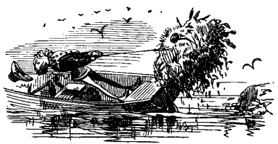 He sailed among a crowd of islands where either the bowsprit or the boom was continually getting caught in the shrubbery and rocks, until he came to island No. 18. Here was a picnic party. For reasons which the accompanying view may render obvious, Mr. P. and his men declined the invitation of the picnickers to stop and join them. The boat continued on until it reached the channel between islands No. 87 and No. 88, and there Mr. P. got out his lines and commenced to fish, trolling his bait behind as the boat slowly sailed, under the hot sun, among those lovely isles, where, to be sure, burning's half o' the sport, but where "burning SAPPHO" would have lost herself utterly, and probably have tumbled into some of the watery intricacies and have put herself out. Mr. P. did not have much luck at first. He caught one muskallonge, after a period of patient waiting which he feels he also must call long, and once, when he thought he was hauling in a fine bass, he turned very red when the boatmen laughed at seeing him "cotch an eel." But after a while he got a royal bite. He hauled in manfully, and although, owing to the intricacies of the channel, he could not see what he had caught, he knew it was a fine fellow from its weight. At last, after tremendous tugging, he got it in over the stem.