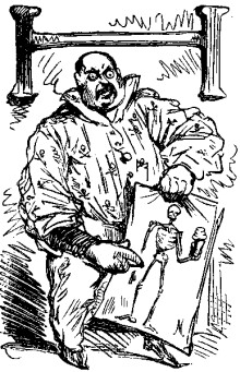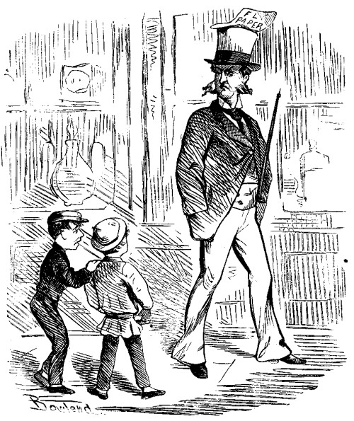 A SCENE FROM OLD NICK-OLOS NICK-OLBY. THE EMPEROR DE MANTALINI GOING TO THE "DEMNITION BOW-WOWS." OUR POLICE REPORT. On Tuesday last a suspicious looking man was arrested by the police, and taken to the One Hundred and Fourth Precinct Station House, on several charges of disorderly acts perpetrated by him in various parts of the city. He gave his name as CHARLES A. DANA, and was locked up for the night. Yesterday morning, prisoner was brought before Justice DOWNY, at the Jephson Market Police Court. Officer LOCUST, being called to testify, stated that his attention was directed to the prisoner, on Tuesday afternoon last, by some boys in Fourteenth Street. Prisoner was standing on the side-walk, on the side of the street opposite Tammany Hall. He was armed with a small pewter squirt, with which he was trying to smear the front of that building by drawing up dirty water from the gutter. The range of the squirt did not appear to reach more than half-way across the street. The water used was very foul, leaving stains upon a dirt-cart that was passing. While witness was watching the prisoner, the Hon. WM. M. TWEED came down the steps from Tammany Hall, and, upon seeing him, prisoner ran away, but was seized by witness, before he could make his escape. On being interrogated by the magistrate, prisoner said that he hardly knew what he was doing when arrested. The Sun was in his eyes at the time. If it hadn't been so, he would not have missed his shot. He must do something for a living, and he thought that throwing dirty water was as good an occupation as any other. Had made money out of it by threatening respectable people with his pewter squirt, and they would give him money rather than have their clothes soiled. He would do anything to make money; and he didn't in the least mind dirtying his hands in the making of it. To a question by the magistrate, as to whether he had had anything to do with casting offal into the bay, prisoner laughed in a wild manner, and said that he, for one, could never be accused of wasting good, honest dirt in that way. All the offal in the world, said prisoner, wasn't too much for him to use in bespattering the objects of his attention, friends as well as foes. He had heaved tons of offal, already, at Mr. A. OAKEY HALL, (whom he evidently imagined to be an Irishman, and called O'HALL,) He didn't care whom he hit, in fact, so long as he could make it pay. A gentleman connected with the velocipede interest, whose name our reporter did not catch, here stated that he became acquainted with prisoner nearly two years ago, while the velocipede frenzy was at its height. He had constructed to order for the prisoner a peculiar velocipede called the "Sun Squirt." It had a Dyer's tub attached to it, which was filled with bilge-water. On this machine, the prisoner, armed with a pewter squirt, used to practise for several hours a day, careering rapidly around the rink, and taking flying shots, as he went, at large posters attached to the wall, having portraits on them of General GRANT, Hon. H. GREELEY, Hon. WM. M. TWEED, The Mayor, Governor HOFFMAN, and several other citizens of admitted position and respectability. The bilge-water usually came back upon him, however, and he was generally a humiliating object on leaving the rink. Prisoner, on being asked by the magistrate whether he had any references respecting character to give, replied in the negative, whereupon orders were issued to lock him up, pending the appearance of Mr. PUNCHINELLO, who will have some statements to make about him at a future day. A reward of $5,000 has been offered for any information about the pewter squirt, and particularly as to when, and by whom it was made; and, as detectives are now engaged in working up the case, there can be but little doubt that the vile instrument will ere long be identified. DISTRESSING. Some awful smasher of cherished notions is trying to make out that ROUGET DE LISLE was not the real author of the famous Marseillaise, but that he stole it from the Germans. It pains us to contemplate the possibility of the charge being true, but, should it prove to be so, we suggest that the name of the accepted author be changed from ROUGET to ROGUEY DE LISLE.