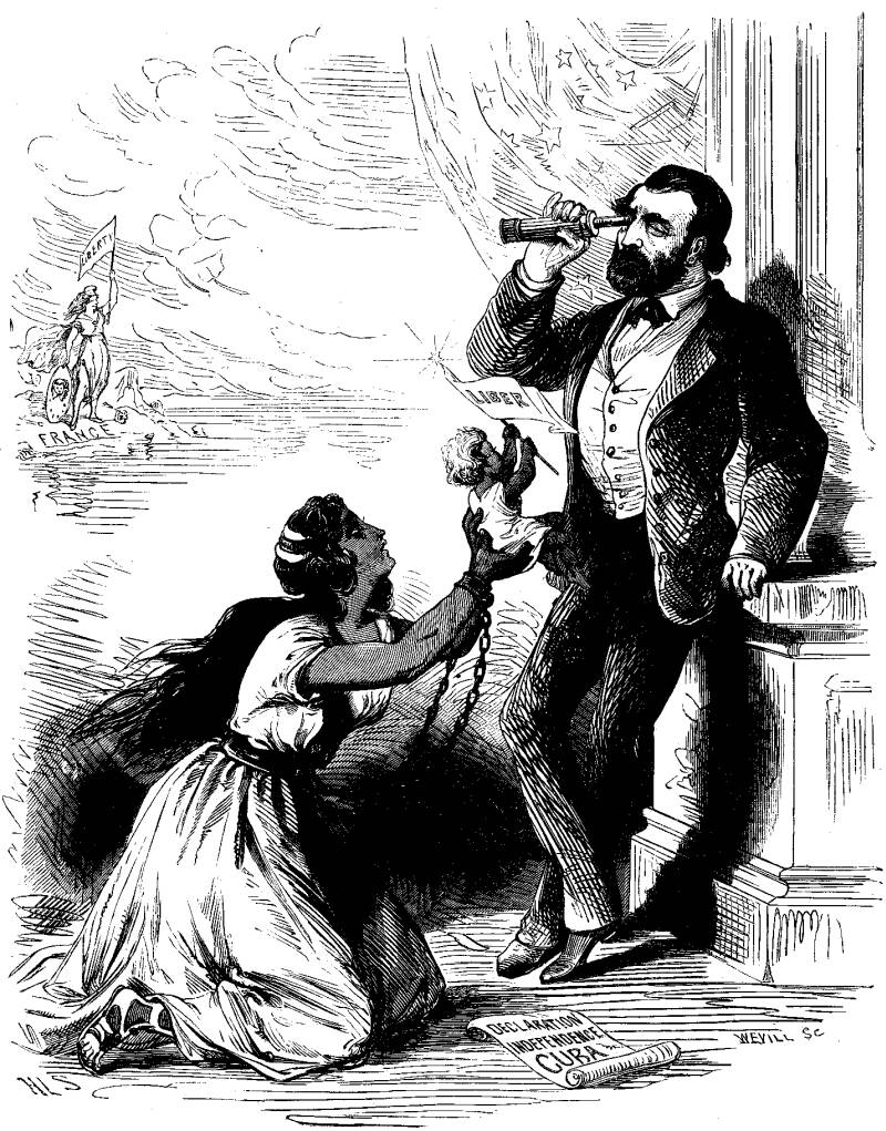 A SIGHT TOO BAD! Struggling Cuba. "YOU MUST BE AWFULLY NEAR-SIGHTED, MR. PRESIDENT, NOT TO RECOGNIZE ME." U. S. G. "NO: I AM FAR-SIGHTED; FOR I CAN RECOGNIZE FRANCE." HIRAM GREEN'S POLITICAL SENTIMENTS. His Reason for Leaving his Party.—A Catechism for Candidates. I hain't gilty of any stated polertix, as Ime aware of. For an old man, Ime helthy and sound as a nut on all public questions. I use to be an old line Whig, and was a pooty active thimble-rigger as long as it paid. But when that party refoosed to renominate me for the offis of Gustese of the Peece, like a thurar bred polertician, I shook 'em. Said I, standin' ontop a sugar hogshead, at a primary meetin, which was bein held in SIMMINSES grocery store:— "Feller sitizens of the Whig party, Refoose to renominate good men for offisses, and you can pack your duds and git your carpet bags checkt for the next steamer goin up Salt River. Leave my name off'n your ticket for another term of offis, and there won't be enuff left in your old politikle carciss to grease a flap-jack griddle with. In the words of Mister—Mister—Somebody, "A word to the wise is—is—enuff to make a—hoss laff." And here I say it, Mister PUNCHINELLO, I wasent nominated. Dident I smash things? Gess not! I norgarated a bolt which spread like pourin keroseen ile over a marble floor, and the next fall, SCOTT & GRAHAM was nockt hire'n the Himmely mountins, while the old Whig party shoveled off its mortil quarrel. Thus, as HORRIS GREELY, in his remarks on politikle Economy, says: "Vengents, like a 2 tined pitchfork in the hands of Old Nick, will bust up any party which goes back onto its trusted leaders. 'Vengents is mine,' says the disappinted offis seeker, and on Election day he peddles split tickets ontil the poles close." Standin as I do on nootral ground, I wish like JOHN BULL I could make my nootrality pay as well as J. B. does, by sellin stores to the Prooshians and the French. In castin my suferage this fall, I shall go Principals not men. A principal which is good for its little 7 per cent. intrest payable semi-annually, is what ales me. High-toned