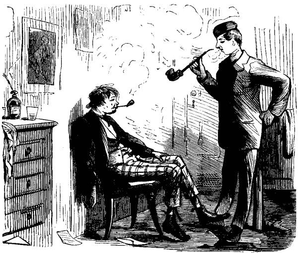 1870, by the PUNCHINELLO PUBLISHING COMPANY, THE MYSTERY OF MR. E. DROOD. AN ADAPTATION. BY ORPHEUS C. KERR. CHAPTER XXV. THE SKELETON IS MCLAUGHLIN'S CLOSET. Night, spotted with stars, like a black leopard, crouched once more upon Bumsteadville, and her one eye to be seen in profile, the moon, glared upon the helpless place with something of a cat's nocturnal stare of glassy vision for a stupefied mouse. Midnight had come with its twelve tinkling drops more of opiate, to deepen the stupor of all things almost unto death, and still the light shone luridly through the window-curtains of Mr. BUMSTEAD'S room, and still the lonely musician sat stiffly at a dinner-table spread for three, whereof only a goblet, a curious antique black bottle, a bowl of sugar, a saucer of lemon-slices, a decanter of water, and a saucer of cloves appeared to have been used by the solitary diner. Unconscious that, through the door ajar at his back, a pair of vigilant human orbs were upon him, the ritualistic organist, who was in very low spirits, drew an emaciated and rather unsteady hand repeatedly across his perspiring brow, and talked in deep bass to himself. "He came in, af'r' bein' brisgly walked up'n-down the turnpike by PENDRAGON, and slammed himself down-'n-that-chair," ran the soliloquy, with a ghostly nod towards an opposite chair, drawn back from the table. "'Inebrious boy!' says I, sternly, 'how-are-y'-now?' He said 'Poorawell;' 'n' wen' down on-er-floor fas'hleep! I w's scan'l'ized.—Whowoonbe?—I took m' umbrella 'n' thrashed 'm with it, remarking 'F'shame! waygup! mis'able boy! 's poorysight-f'r-'nuncle-t' see-'s-nephew-'n-this-p'litical-c'ndit'n.'—H'slep on; 'n' 't last I picked up him, 'n' umbrella, 'n' took 'm out t' some cool place t'shleep't off. Where'd' I take him? Thashwazmarrer—where'd' I leave'm?" Repeating this question to himself, with an almost frenzied intensity, the gloomy victim of a treacherous memory threw an unearthly stare of bloodshot questioning all over the room, and, after a swaying motion or two of the upper half of his body, pitched forward, with his forehead crashing upon the table. Instantly recovering himself, and starting to rub his head, he as suddenly checked that palliative process by a wild run to his feet and a hideous bellow. "I r'memb'r, now!" he ejaculated, walking excitedly at a series of obtuse angles all over the apartment. "Got-'t-knockedinto-m'-head-'t-last. Pauper bur'l ground—J. M'GLAUGHLIN. Down'n cellar—cool placefa' man's tight—lef' m' umbrella there by m'stake—go'n' get't thishmin't—" Managing, after several inaccurate aims at the doorway, to plunge into the adjacent bedroom, he presently reappeared from thence, veering hard-aport, with a lighted lantern in his right hand. Then, circuitously approaching the neglected dining-table, he grasped with his disengaged digits at the antique black bottle, missed it, went all the way around the board before he could stop himself, clutched and missed again, went clear around once more, and finally effected the capture. "Th 'peared t' be two," he muttered, placing the prize in one of his pockets; and, with a triumphant stride, made for the half-open hall-door through which the eyes had been watching him. The owner of those eyes, and of a surprising head of florid hair, had barely time to draw back into the shadow of the corridor and notice an approaching face like that of one walking in his sleep, when the clove-eater swung disjointedly by him, with jingling lantern, and went fiercely bumping down the stairway. Closely, without sound, followed the watcher, and the two, like man and shadow, went out from the house into the quarry of the moon-eyed black leopard. Fully bound now in the sinister spell of the spice of the Molucca islands, Mr. BUMSTEAD had regained that condition of his duplex existence to which belonged the disposition he had made of his lethargic nephew and alpaca umbrella on that confused Christmas night; and with such realization of a distinct duality came back to him at least a partial recollection of where he had put the cherished two. Finding Mr. E. DROOD rather overcome by the more festive features of the meal,—notwithstanding his walk at midnight with Mr. PENDRAGON,—he had allowed his avuncular displeasure thereat to betray itself in a threshing administered with the umbrella. Observing that the young man still slept beside the chair from which he fell, he had ultimately, and with the umbrella still under his arm raised the dishevelled nephew head-downward in his arms, and impatiently conveyed him from the heated room and house to the coolest retreat he could think of. There depositing him, and, in his hurry, the umbrella also, to sleep off, under reviving atmospheric influences, the unseemly effect of the evening's banquet, he had gone back on both sides of the road to his boarding-house, and, with his boots upon the pillow, sunk into an instantaneous sleep of unfathomable depth. Dreaming, towards morning, that he was engaging a large boa-constrictor in single combat, and struggling energetically to restrain the ferocious reptile from getting into his boots, he had suddenly awakened, with a crash, upon the floor—to miss his umbrella and nephew, to forget where he had put them, and to fly to Gospeler's Gulch with incoherent charges of larceny and manslaughter. All this he could now vaguely recall, his present psychological condition, or trance-state, being the same as then; and was going entrancedly back to the hiding-place where, with the best of motives, he had forgetfully left the two objects dearest to him in life. On, then, proceeded the Ritualistic organist in the tawny light of the black leopard's eye: his stealthy follower trailing closely after in the shade of the roadside trees where the star-spotted leopard's black paws were plunged deepest. On he went, in zig-zag profusion of steps and occasional high skips over incidental shadows of branches which he for sna