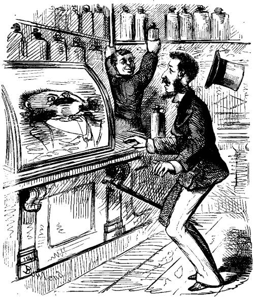FRIGHTFUL SHOCK SUSTAINED BY BEAU BIGSBY ON BEING SUDDENLY OUR PORTFOLIO. "Up in a balloon, boys!"—Macbeth. TOURS, FIFTH WEEK Of THE REPUBLIC, 1870. DEAR PUNCHINELLO: To all men of lofty ambition I would recommend a balloon excursion. The higher you get, the smaller and more insignificant do earthly things appear. A balloon is the best pulpit imaginable from which to preach a sermon upon the littleness of mundane realities, first—because no one can hear you, and your congregation cannot therefore be held responsible for indifference to your teaching; and second—because at that height you are fully impressed with the truth of what you say. Aspirations of whatever kind, all longings and emotions of the "Excelsior" order, all appeals to "look aloft," come handier when you can "do" them in an aerial car. You will pardon this philosophic digression in respect to the peculiar feelings of a man who has just been "up in a balloon." Our air-ship had been anchored in the Champ de Mars two days, waiting for a fair wind. An hour before we started, a Yorkshireman, who had evidently never seen such a creation before, annoyed me with incessant questions as to what it was. His large, wondering, stupid eyes never ceased gazing at the monster as it tugged heavily at the stake which held it. "Na' wha' maun that be?" he exclaimed, starting back as it gave a very violent jerk. I could stand it no longer, and thus broke forth:— "See here, my good fellow, you've got plenty of cheek to be bothering me with your confounded ridiculous questions; and so I'll answer you once for all. What you see tied fast there is called a balloon, and it's only a French method of drawing Englishmen's teeth." He left me—I trust not in anger; but that was the last I saw of the Yorkshireman. We got off, (M. GODARD and I) about four o'clock P.M., and ascended steadily till Paris, with its rim of fortifications, looked more like the crater of a volcano than anything else. I brought out my opera-glass as we moved in the direction of Versailles, and reconnoitred the situation. In a field adjoining the palace I saw an object that looked like a post driven into the ground, and capped with a large-sized clam-shell. GODARD levelled his glass and examined it. His lip curled proudly with scorn as he said:— "That is the butcher himself, WILLIAM of Prussia. The clam-like appearance you notice is due to the baldness of his head." I only said: "Can it be possible?" and we moved on. How my blood throbbed as we cavorted through the blue depths of heaven! I was far from feeling blue myself, and GODARD said that if anything I was green. The bearings of the remark did not strike me at the time, as a cannon-ball from the direction of Versailles whirled within twenty feet of the balloon and lifted the right flank (a military expression) of my moustache into your subscriber's eye, notwithstanding it was waxed with LOUVET'S best, warranted to keep each hair en règle, even in the worst gales. From that moment I renounced LOUVET. Following the cannon-shot came a miscellaneous assortment of small projectiles, which had the effect of creating some excitement among the atmospheric animalculae, but failed to disturb the serenity of M. GODARD or myself. When about ten miles from Blois I detected what I supposed was a large vein of chalk-pits. It was very white, and apparently motionless. My companion expressed his surprise at the difficulty I had in distinguishing objects correctly, and seemed to lose patience. "Bigarre, you no know zat? It ees ze dirty Proosien linen vashed out, and hoong zere to dry!" I told him in Arabic that he needn't get his back up; but he understood me not, and continued playing with the cats which we were transporting to Tours to protect the Commissary stores from the ravages of the rats that the Prussians had despatched to eat up the provisions of the garrison. Towards night I began to have a queer sensation in the stomach. It wasn't like sea-sickness, nor like the feeling produced by swinging. If a man just recovering from the effects of his first cigar were offered a bowl of hot goose-grease for supper, I suppose he would have felt as I felt. At the moment a queer twinge took me; I ejaculated: "Oh! Lord!" "Vat ees de matter?" inquired GODARD. If the man had had any other nationality, I might have talked sense to him; but he was a Frenchman, so I said:— "Do you love me?" "Do I loves you?" "Yes!" I roared frantically, "do you love me?" "Begaire I dunno, but I zinks so." "Then," said I, dimly discerning a chance of relief from my suffering, "throw me out as ballast." "Oh, horrible! horrible! Mon Dieu! vat a man!" I turned my sickly gaze upon him and saw that he was deadly pale, and that the perspiration stood out in great drops upon his forehead. The explanation was plain enough—he took me for a maniac. I would have protested and moved the previous question, but taking a small phial from his pocket he broke off the head and threw the contents in my face. Ten seconds later I was totally oblivious, and upon recovering found myself in this place, where such strange things are going on that my fingers prick to write them. DICK TINTO. AN EX-MONSTER. It is a bad day for monarchs. Boston has, for several weeks, had upon Exhibition His Marine Majesty the Whale. The captive was shown for the ridiculously small sum of two shillings, and great was the gathering to gaze upon the spouter, who would have come just in time to attend the political caucuses, only he happens to be dead, and cannot spout any more, albeit his jaw is still tremendous. His defunct condition renders it unnecessary to feed him upon JONAHS, which is lucky for a good many superfluous voyagers upon the Ship of State. If the King of All the Fishes can draw such crowds at a quarter a head, what a chance is there for our friend LOUIS NAPOLEON! If he will but make an Exhibition of himself in this country, we promise him full houses, and a greater fortune than that wh